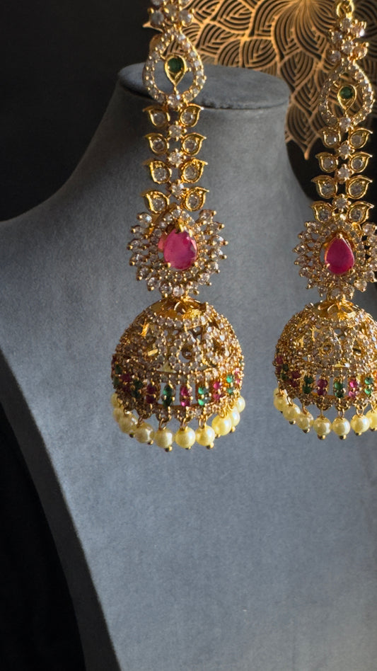 Ruby Gold plated Jhumka with Ear Chain South Indian Earrings - TRADITIONAL