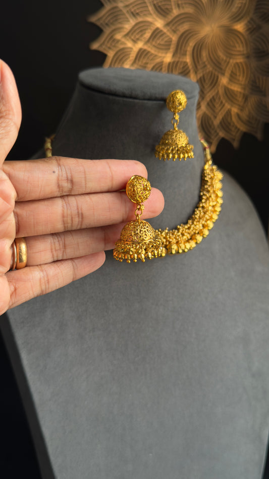 Cluster pearl matt gold Gold South Indian jewelry Necklace jhumka Set - TRADITIONAL