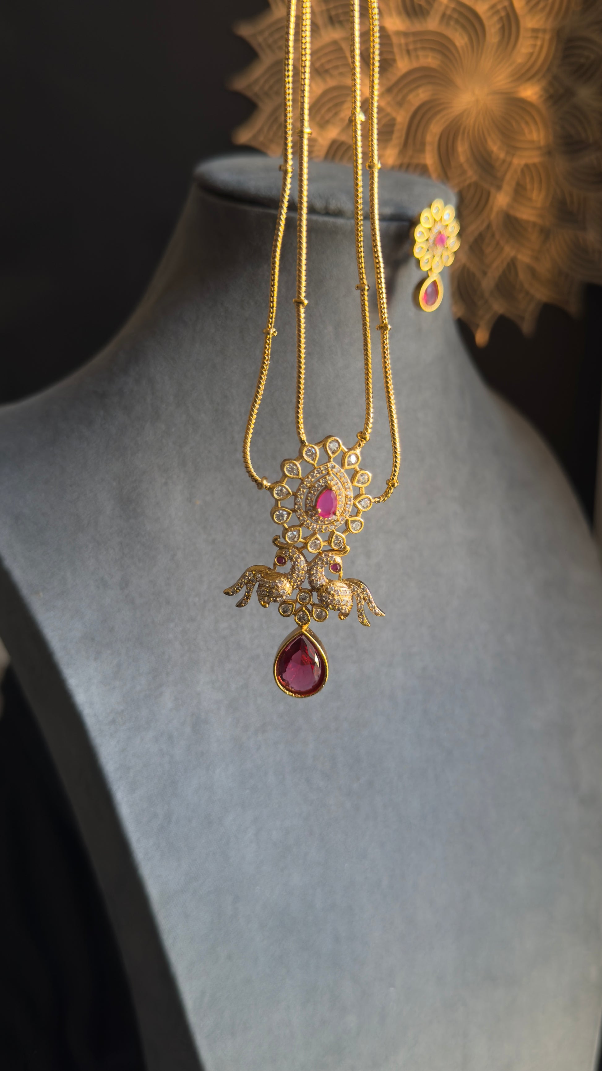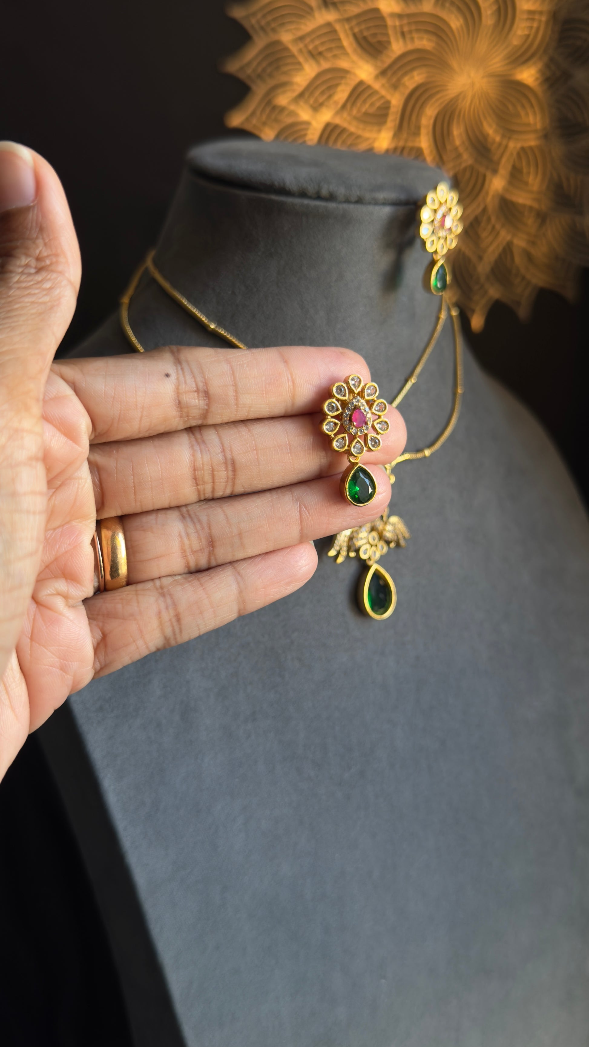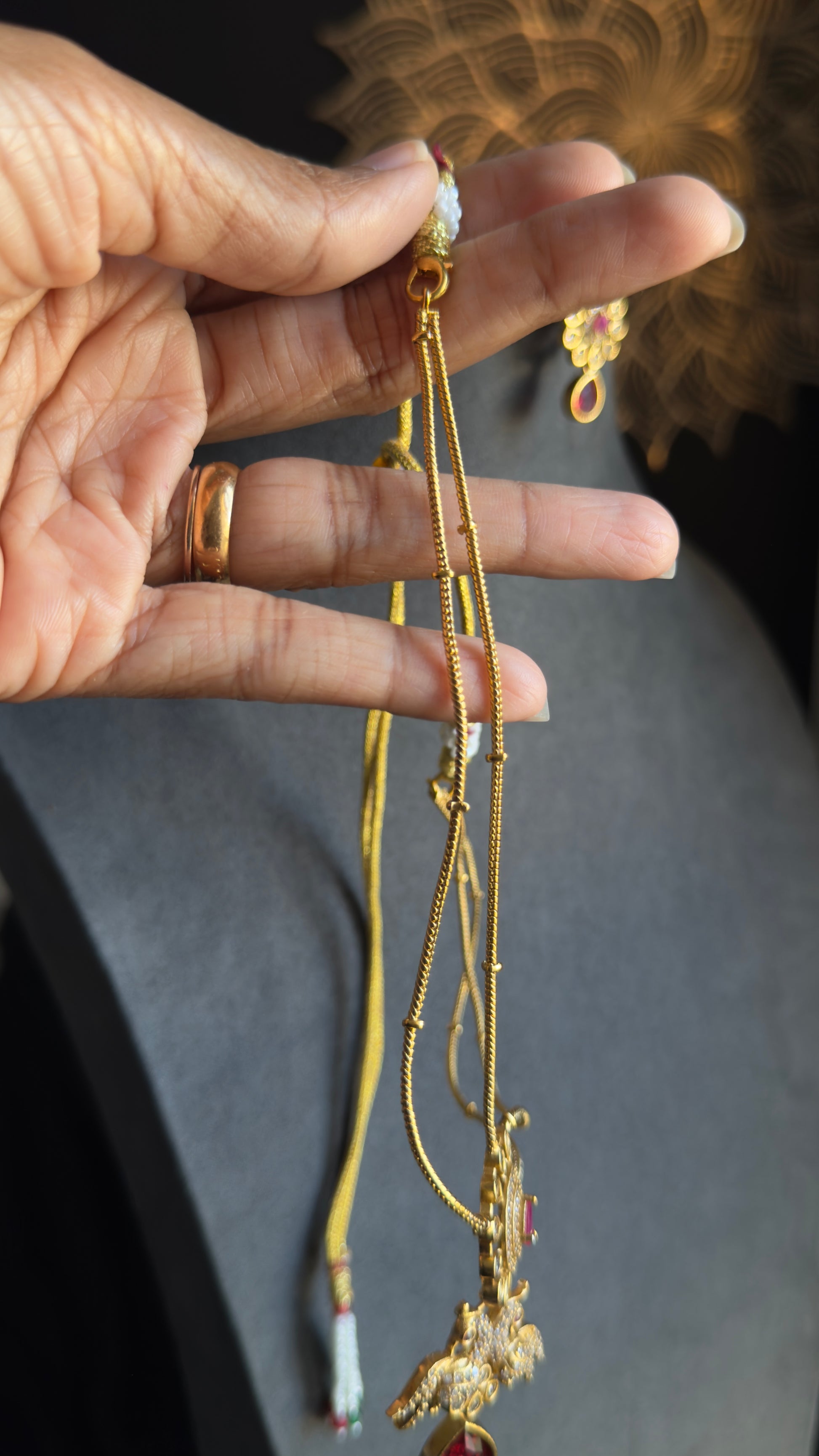 2 line Matt Gold Peacock Pendant Indian Necklace Set flower dangler- AMERICAN DIAMOND