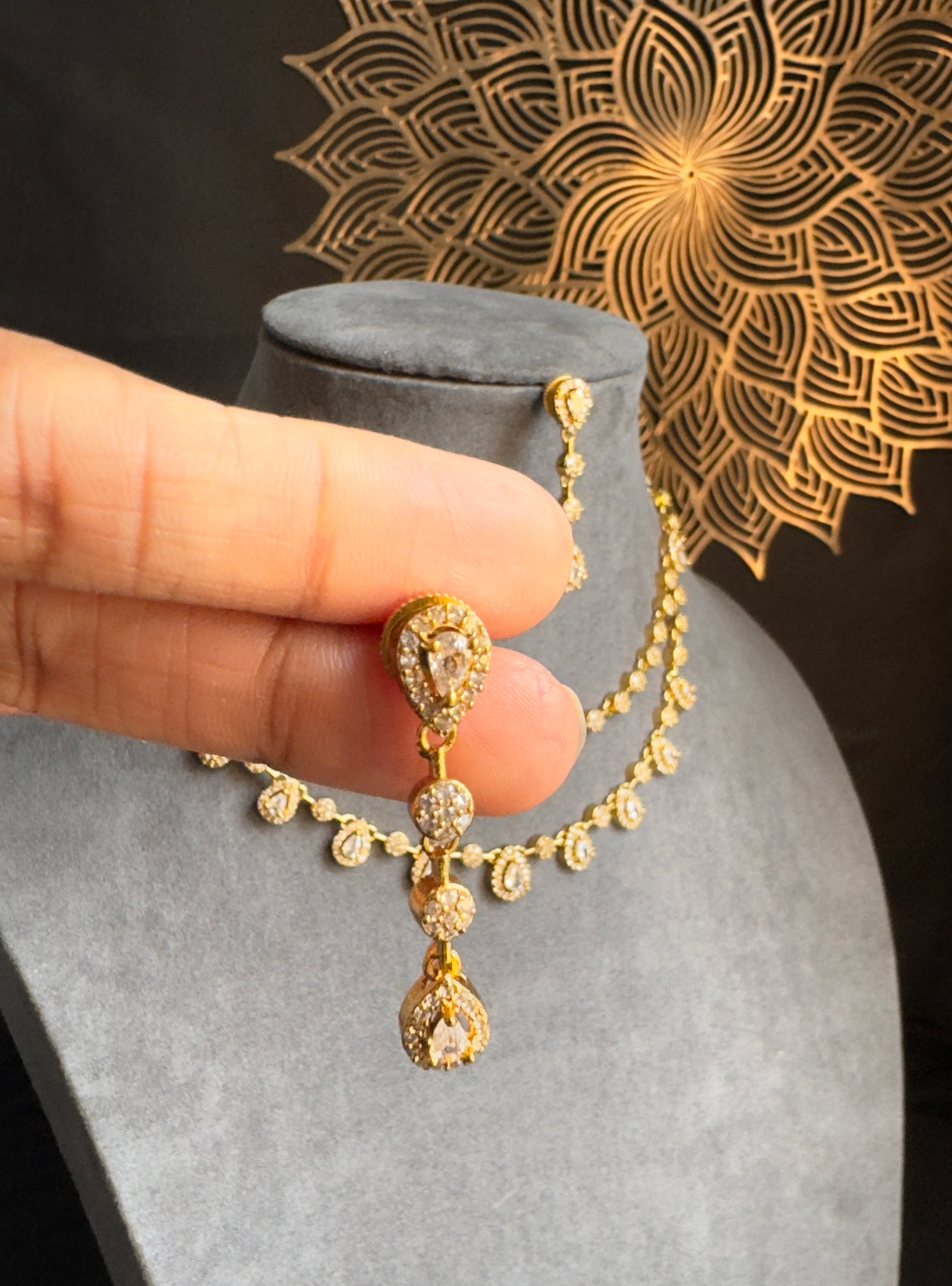 2 line Matt Gold Tear drop Pendant Indian Necklace Set - AMERICAN DIAMOND