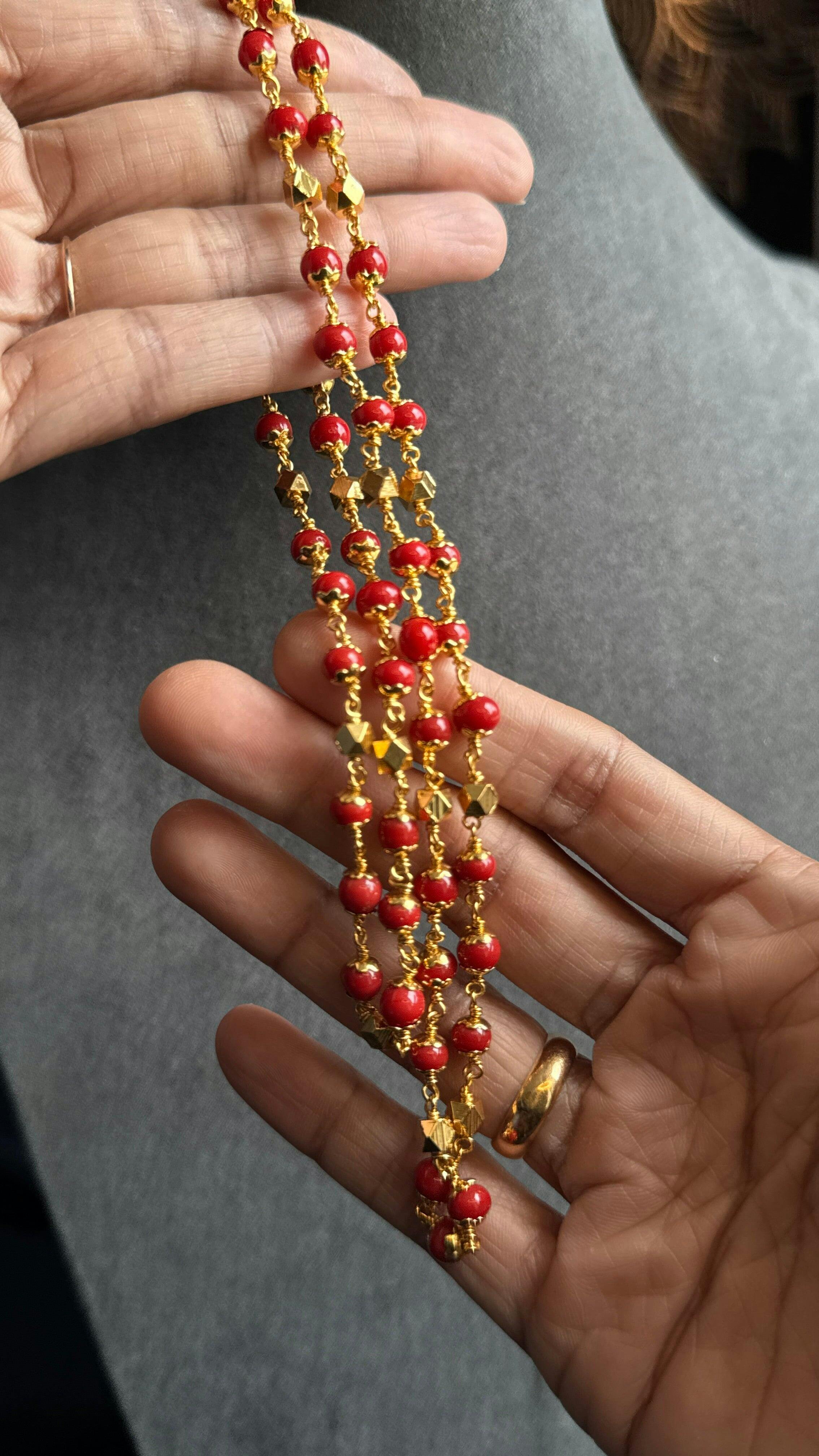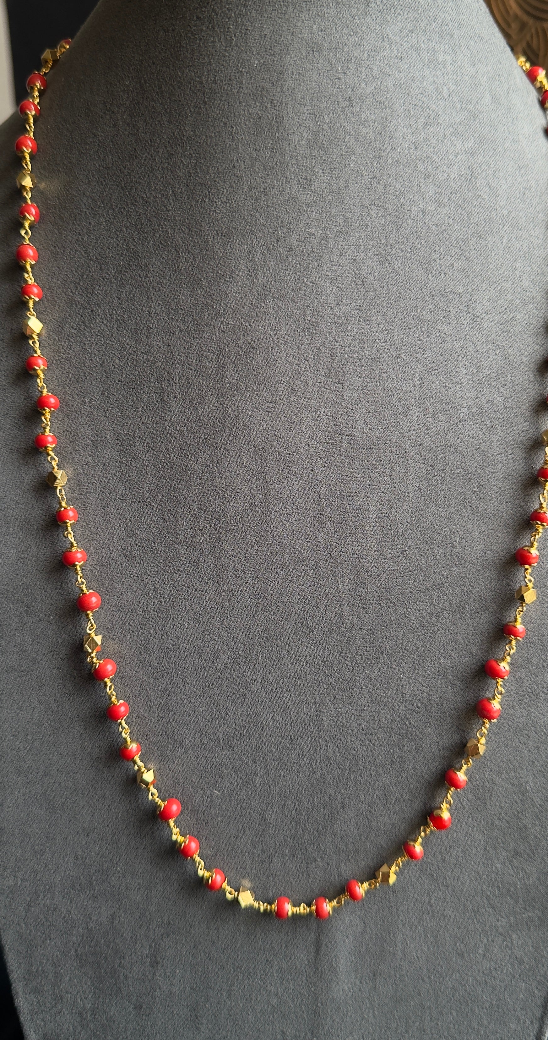 Add a touch of timeless elegance to your jewelry collection with our 24-Inch Coral Bead Mala Necklace. This exquisite piece features adorned with rich coral beads, all beautifully interlinked with a 23.5ct micro gold finish.