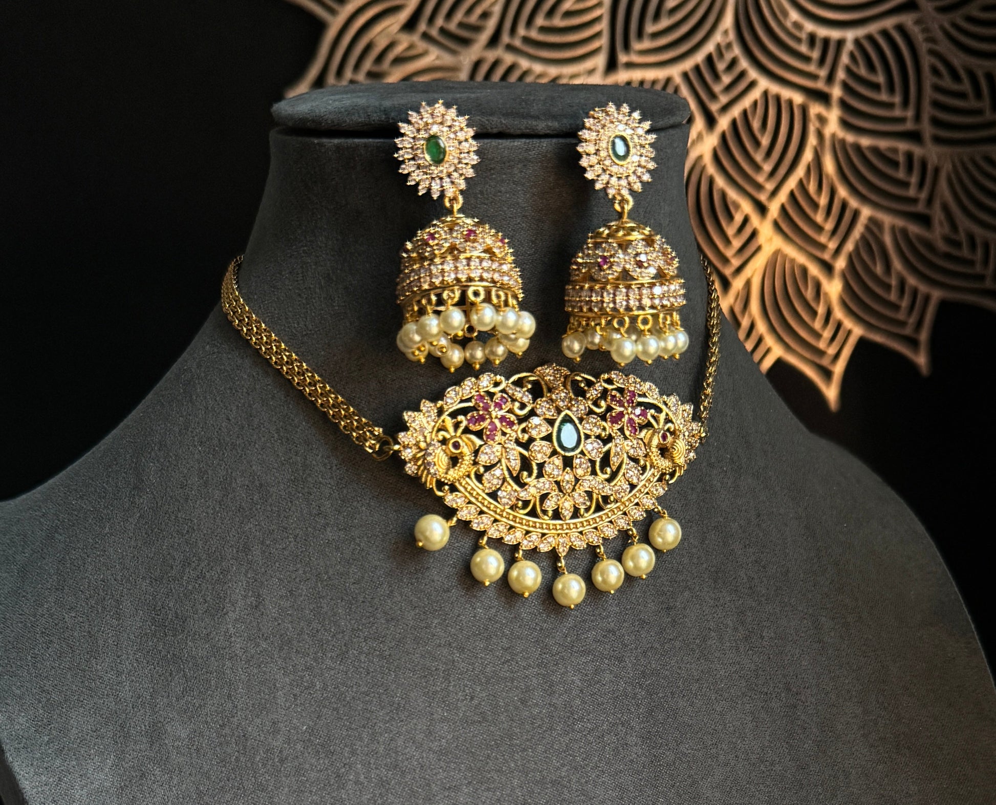 AD Gold Choker Necklace Set Jhumka - TRADITIONAL