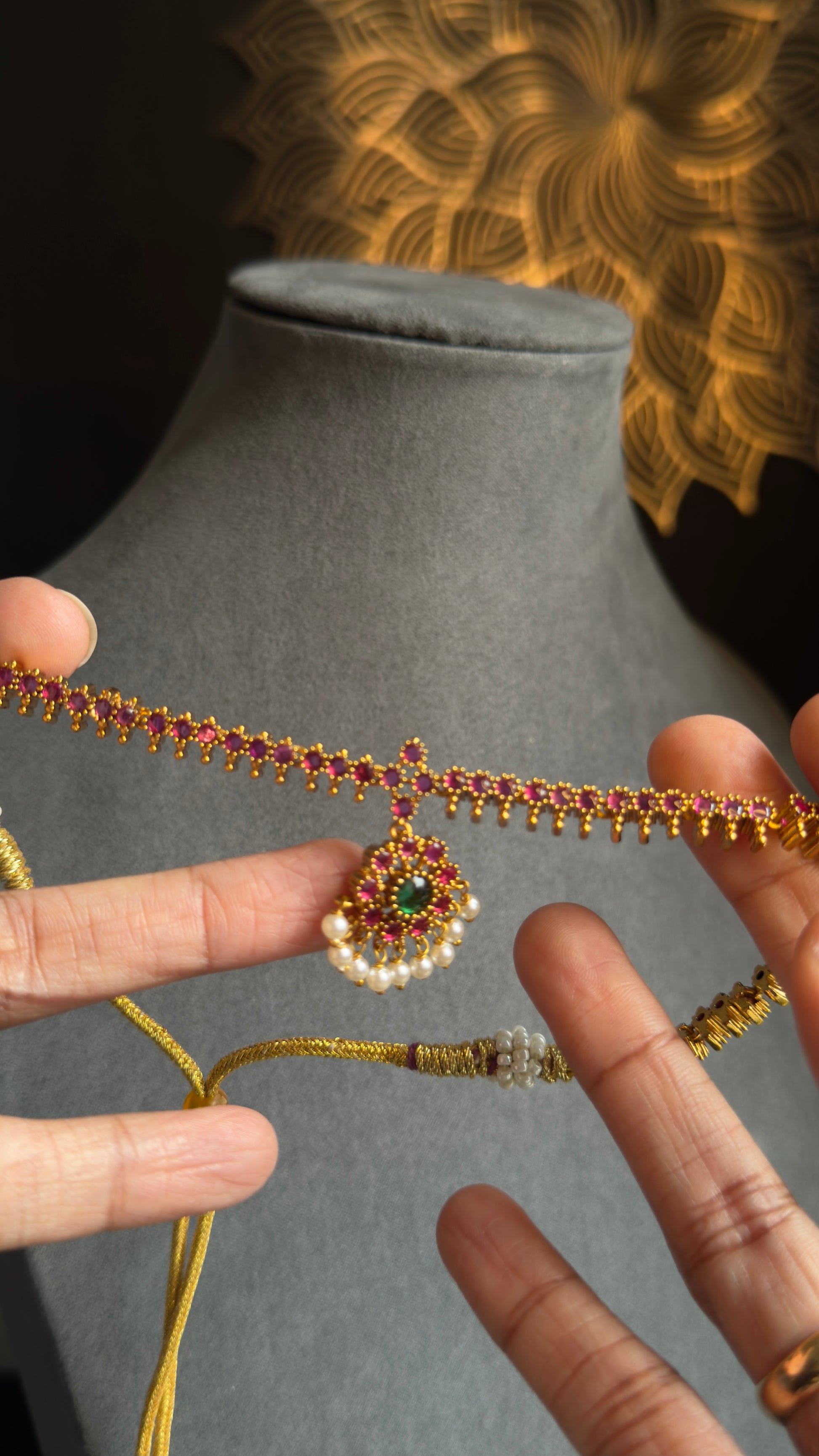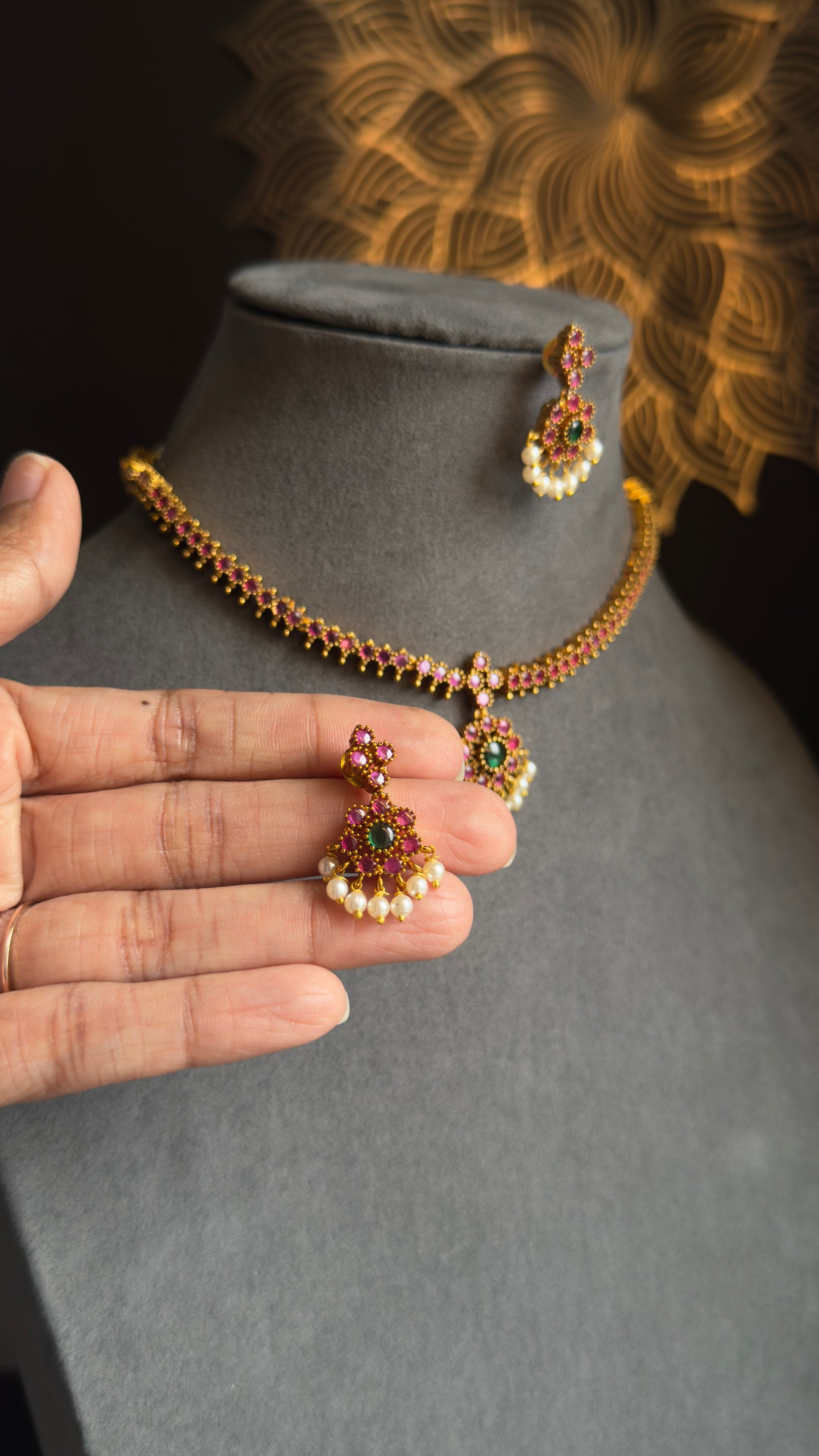 Adorn yourself with the elegance of this Traditional Kemp Necklace Set, beautifully crafted with rich ruby accents. This exquisite South Indian jewelry set features a stunning necklace paired with matching earrings, both adorned with classic Kemp stones that shimmer with a deep red hue.