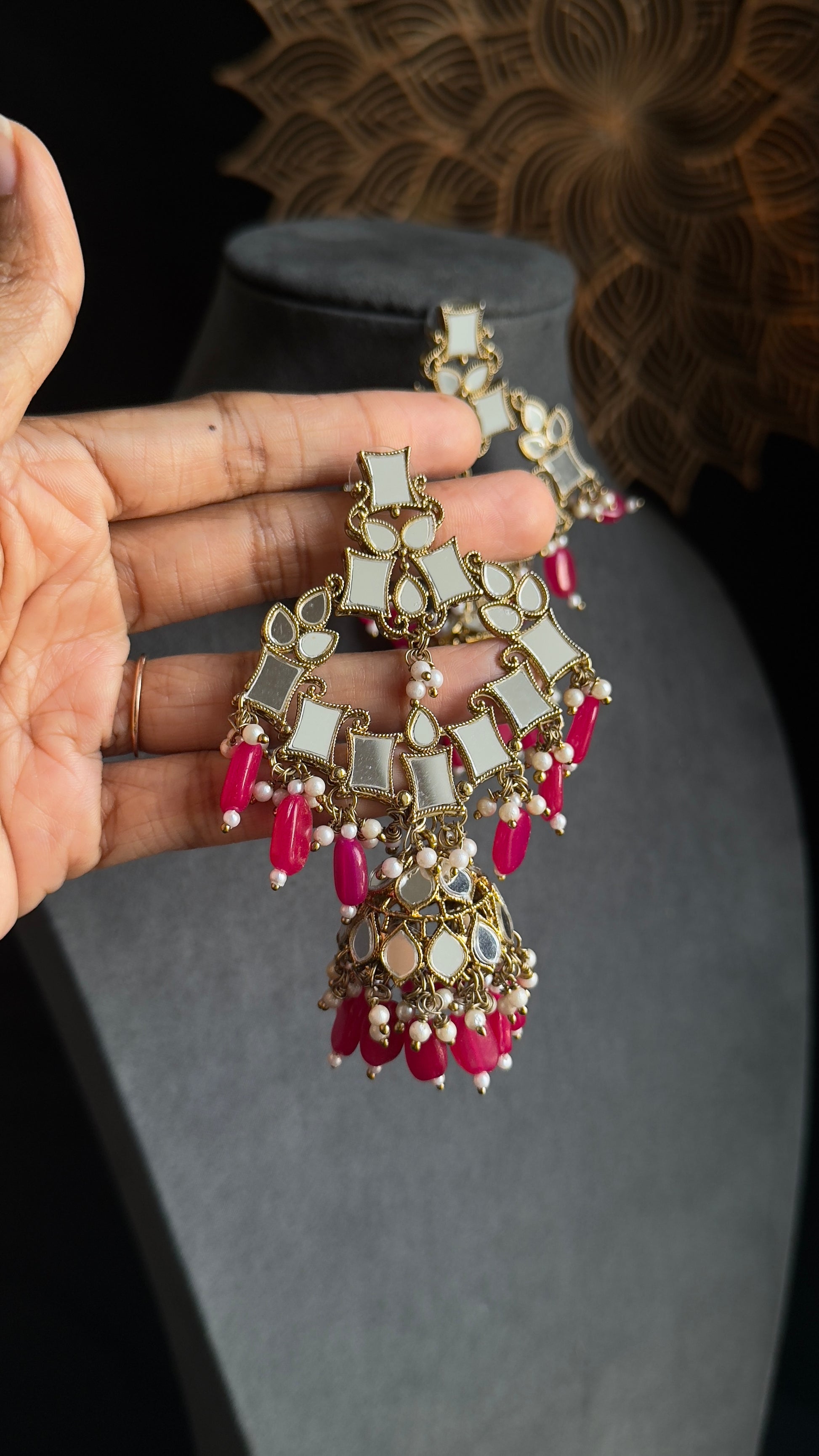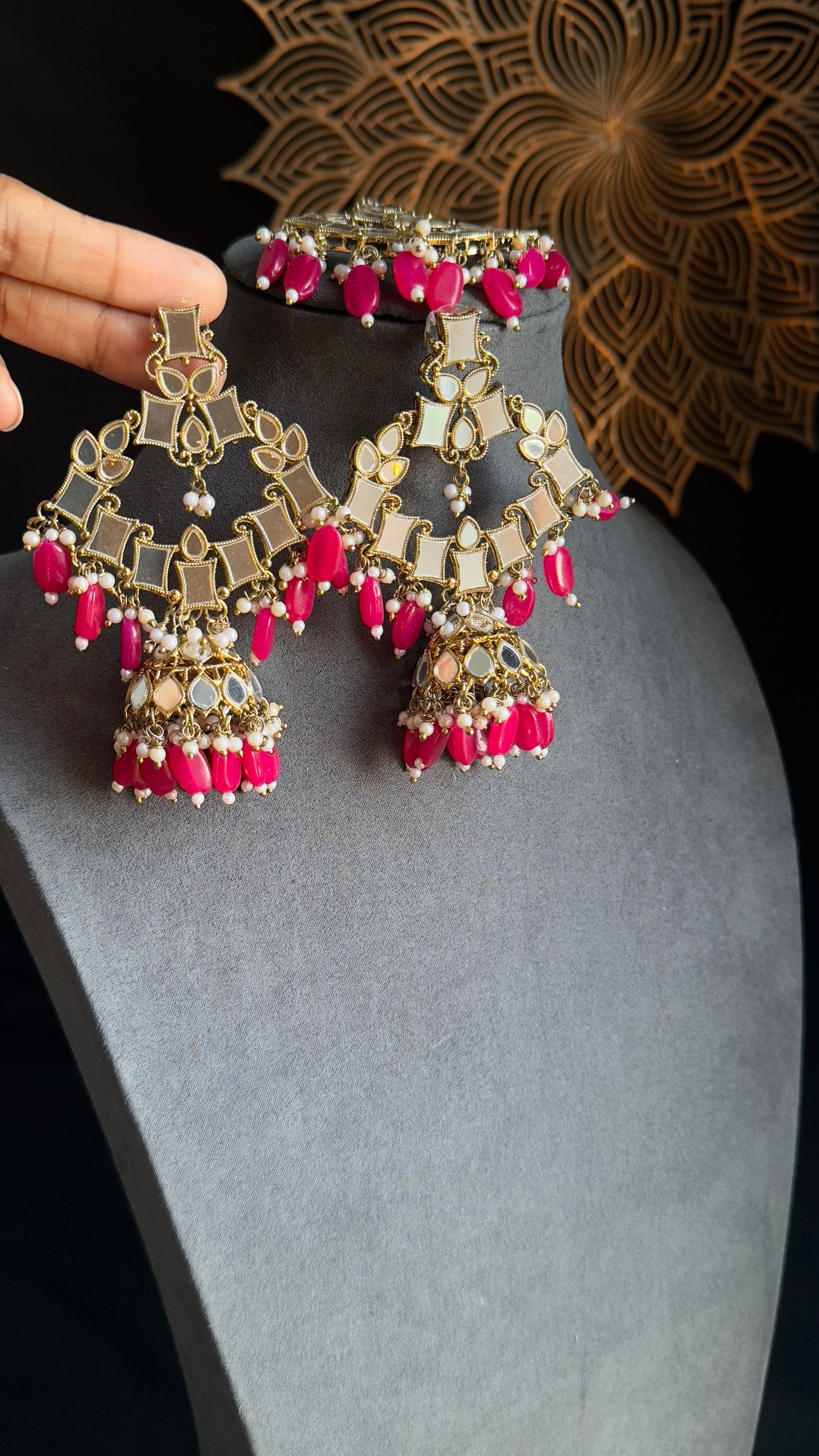The set includes statement Chandbali Jhumka earrings and a matching tikka, making it perfect for weddings, festivals, and special occasions. The combination of Mirror work with the rich hues of ruby and pearls reflects the timeless beauty of Indian craftsmanship, making this set a must-have for girls who want to shine on their special day.