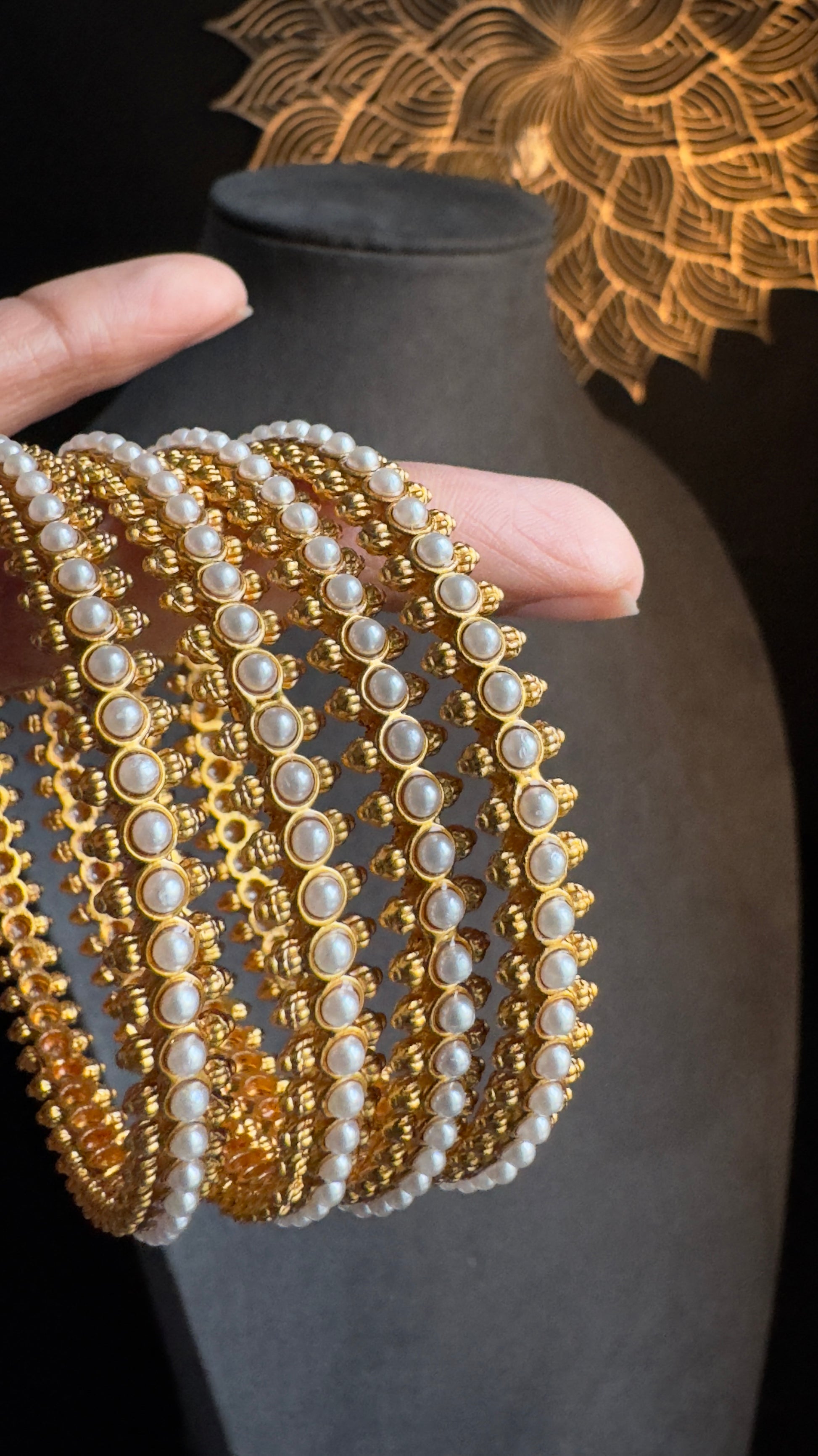 Enhance your traditional ensemble with this budget-friendly set of gold bangles. These elegant bangles are adorned with pearl look-alike stones, offering a luxurious appearance without the premium price. Perfect for South Indian attire, this set of 4 bangles is versatile enough to be worn at weddings, festivals, or even daily. Crafted with attention to detail, these bangles combine affordability with style, making them a must-have addition to your jewelry collection.