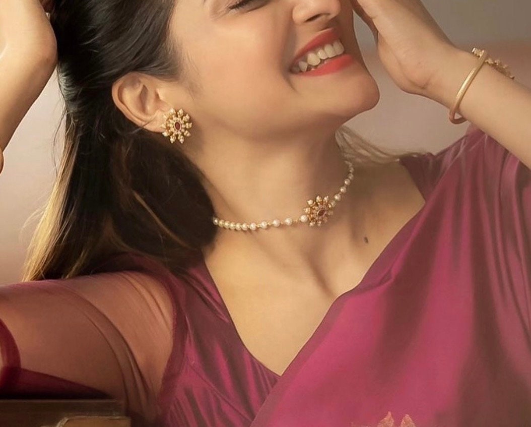 Elevate your traditional look with this stunning Kemp Pearl Choker set, featuring a beautifully crafted choker necklace with a central sunburst pendant adorned with red and green stones, surrounded by lustrous pearls. The matching earrings echo the pendant design, creating a cohesive and elegant set perfect for weddings, festivals, and special occasions.