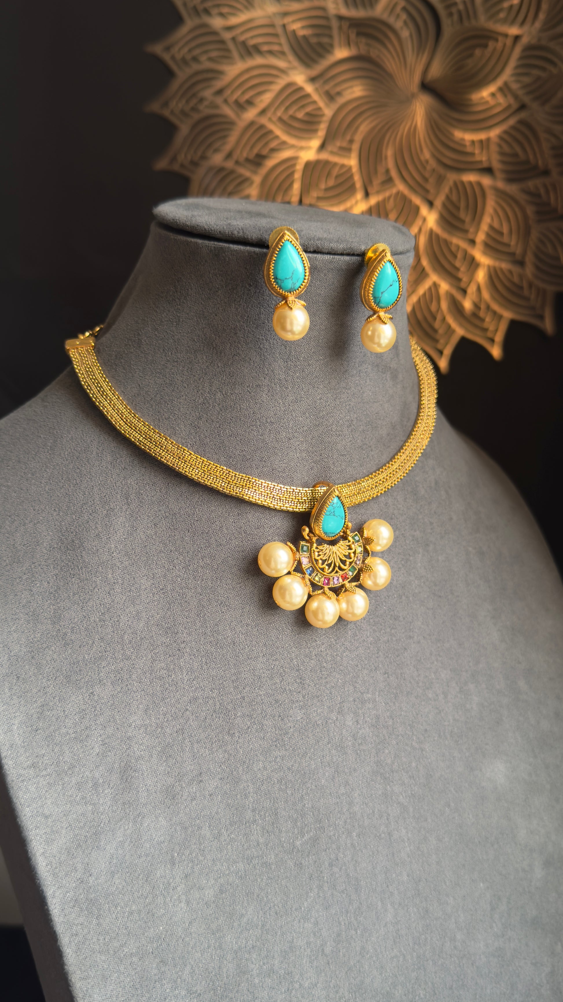 • Elegant Diya pendant design with pearl accents