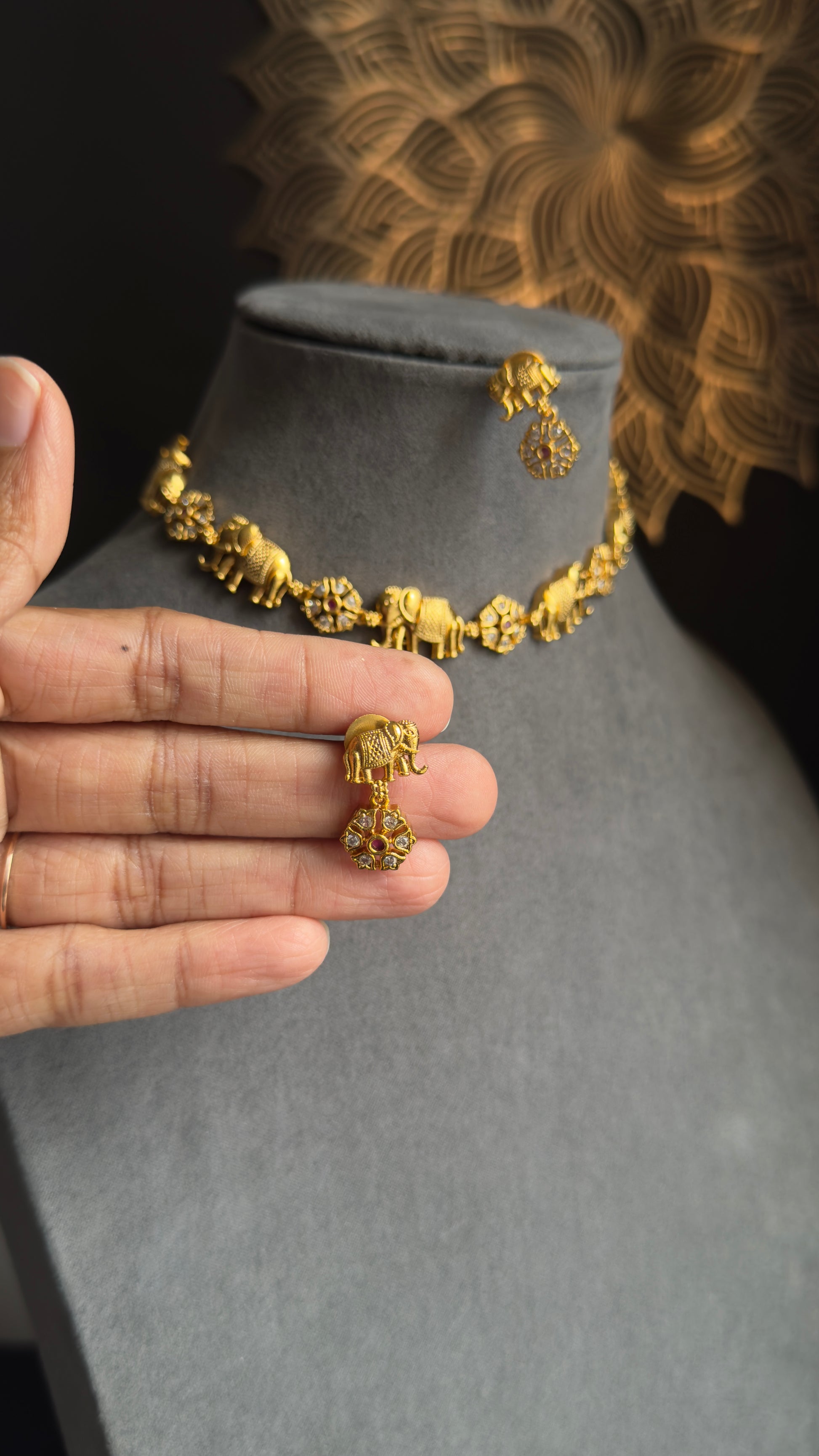 Embrace the divine elegance of our Elephant South Indian Matte Gold Necklace Set, featuring intricately designed Elephant motifs and complemented by matching elephant earrings. This exquisite quirky jewelry set is perfect for traditional occasions and adds a touch of antique charm to your ethnic collection.