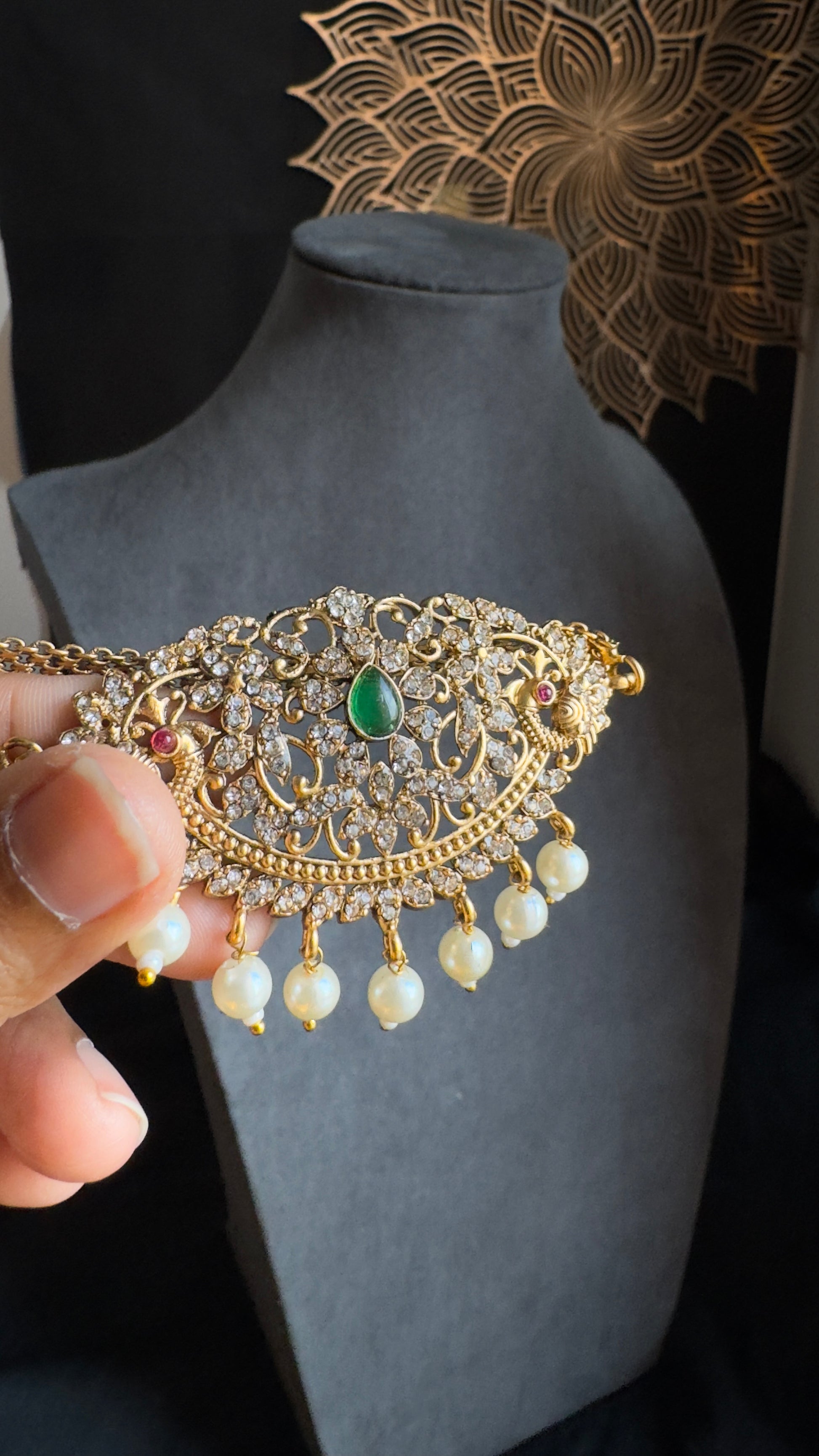 This exquisite necklace set is adorned with American Diamond look-alike stones, offering a luxurious design at a budget-friendly price.