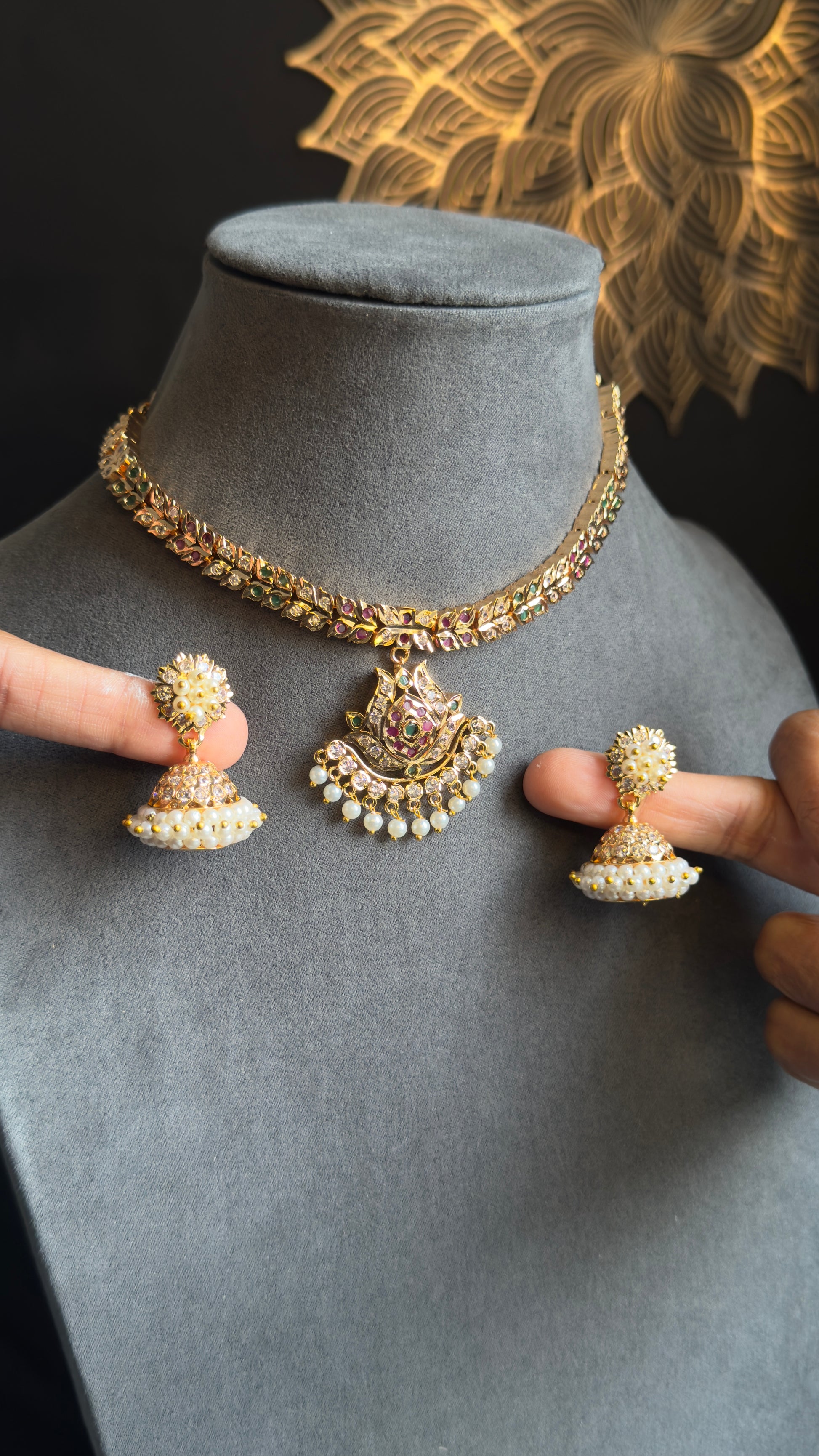 Discover the traditional Short Necklace Set in Atigai Style features stunning adorned American Diamond stones with jhumka.