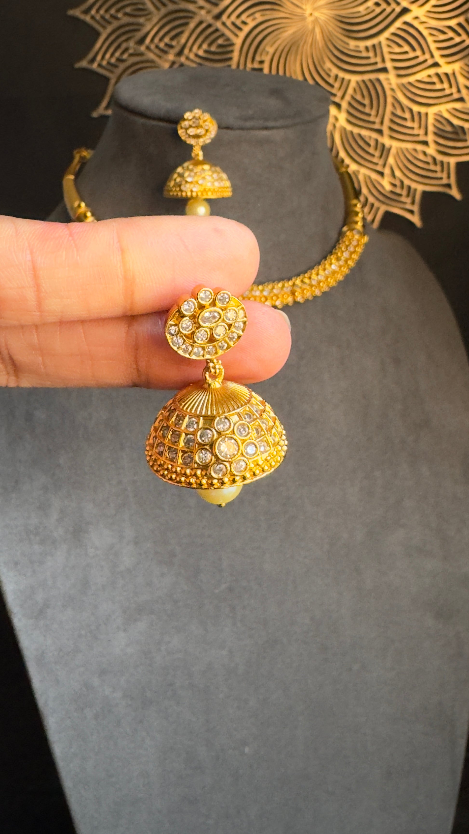 Elevate your traditional attire with our kada Inspired Gold Plated Hasli Choker, featuring stunning white AD stones. This elegant kemp-studded short neckpiece with matching earrings, inspired by South Indian fusion designs, is perfect for weddings, festivals, and special occasions.