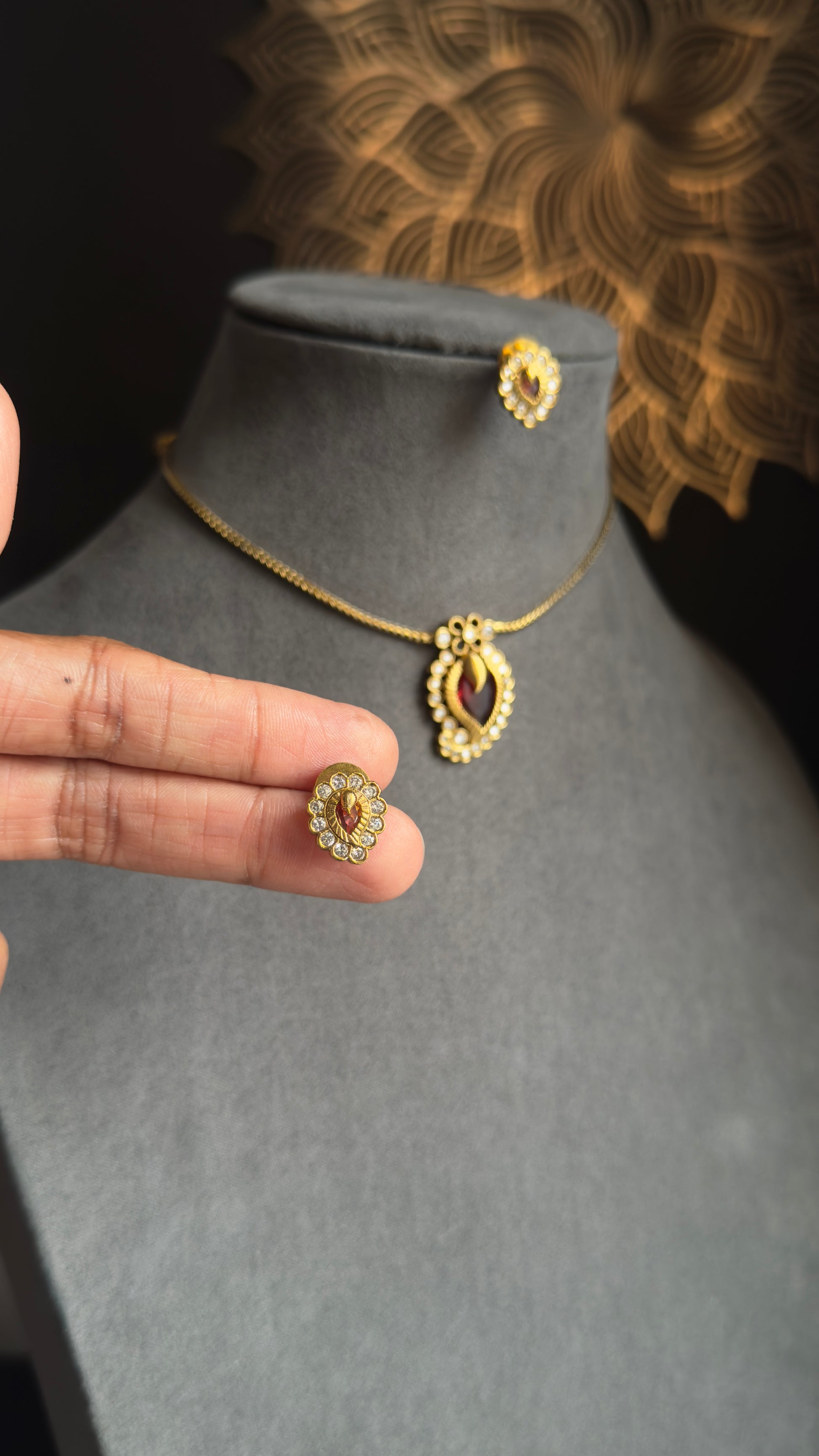Bring home the timeless charm of Kerala traditions with this Kerala-style Mullamottu pendant set. Featuring a delicate mango/paisley design, sparkling CZ stones, and matching earrings, this set is perfect for daily wear, festivals, and traditional occasions.