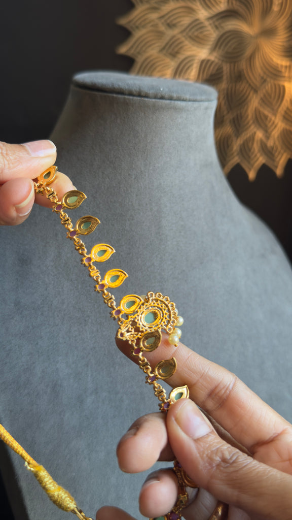 This stunning piece features the iconic Palakka motif with a classic pendant—a classic design deeply rooted in Kerala's cultural heritage. Adorned with rich emerald green stones and sparkling ruby red accents, this set is a perfect statement piece for weddings, major festivals, and traditional dance performances.