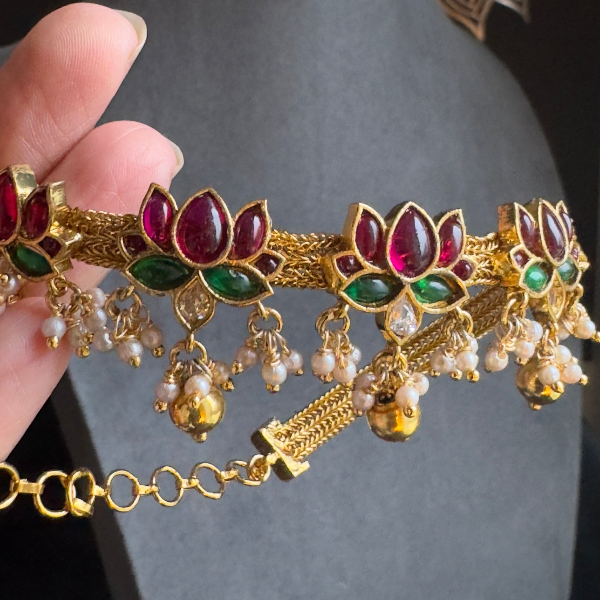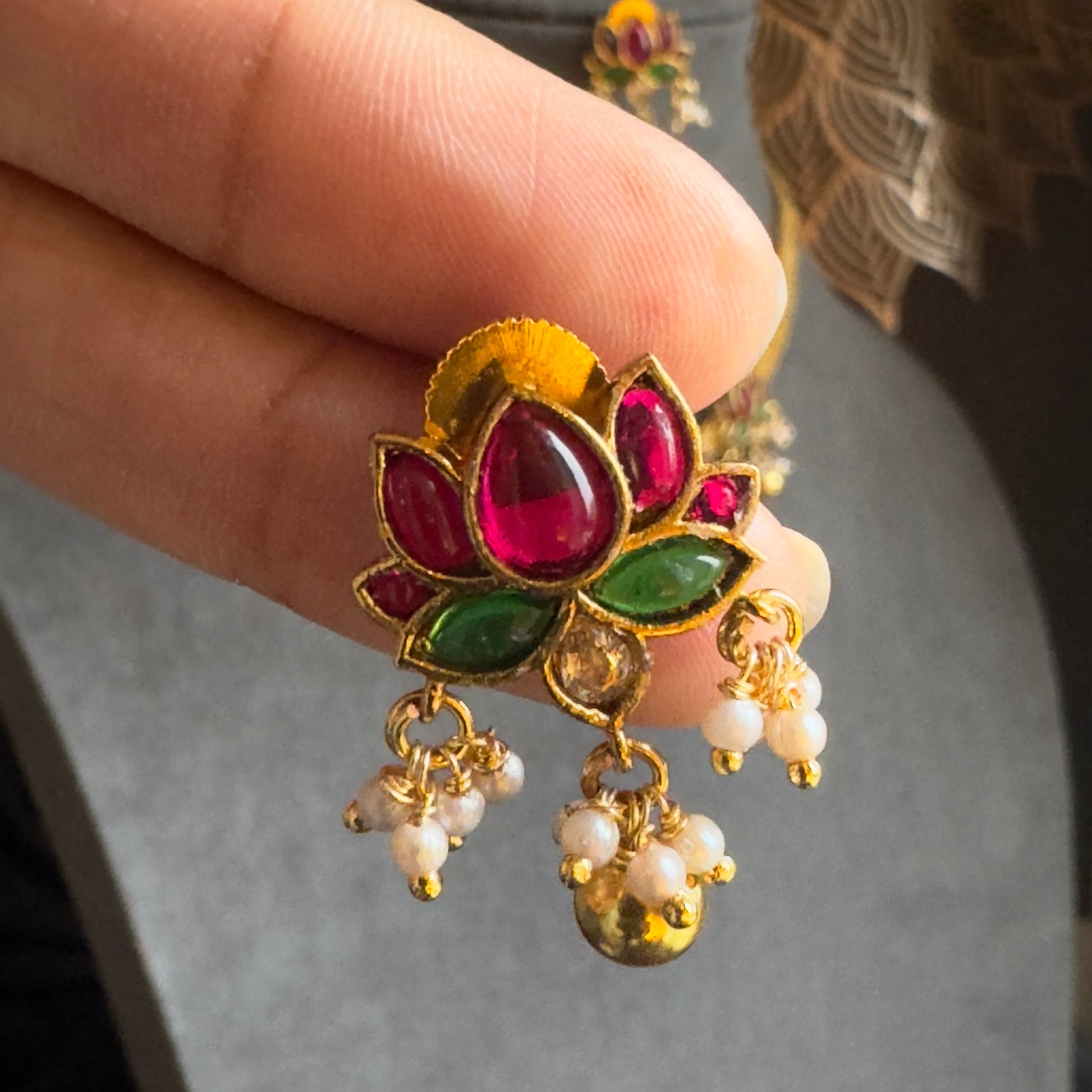 Adorn yourself with the elegance of our Lotus Antique Gold-Plated Choker, featuring intricate lotus motifs and complemented by matching lotus earrings. This South Indian traditional jewelry set, crafted in matt gold, is embellished with hanging pearls and kemp stones, making it a perfect choice for weddings, festivals, and special occasions. The antique design adds a touch of heritage charm to your ethnic collection.