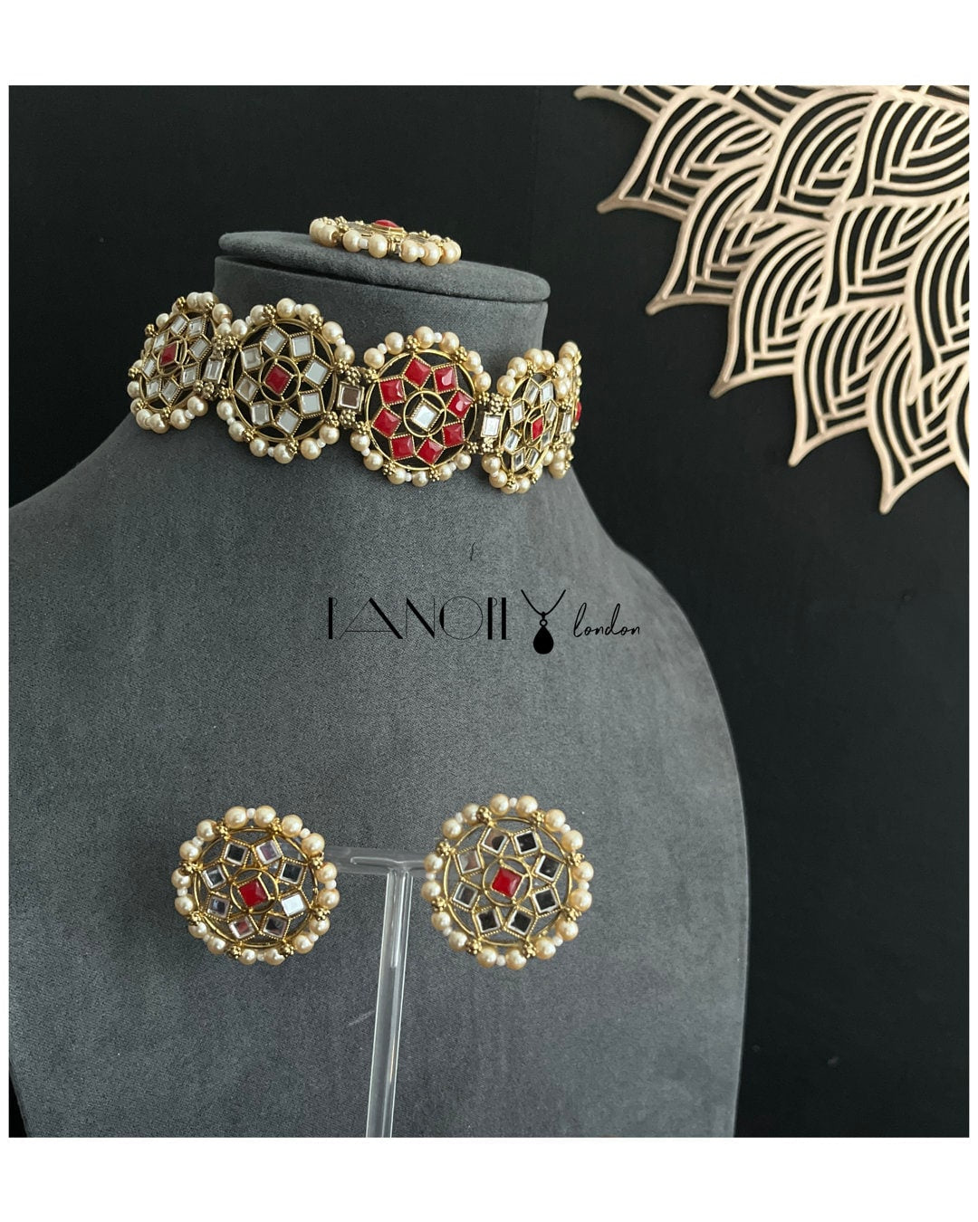 This exquisite Faux Kundan choker set is the epitome of luxury, featuring intricate kundan stones surrounded by delicate faux pearls anf Mirror detailing.