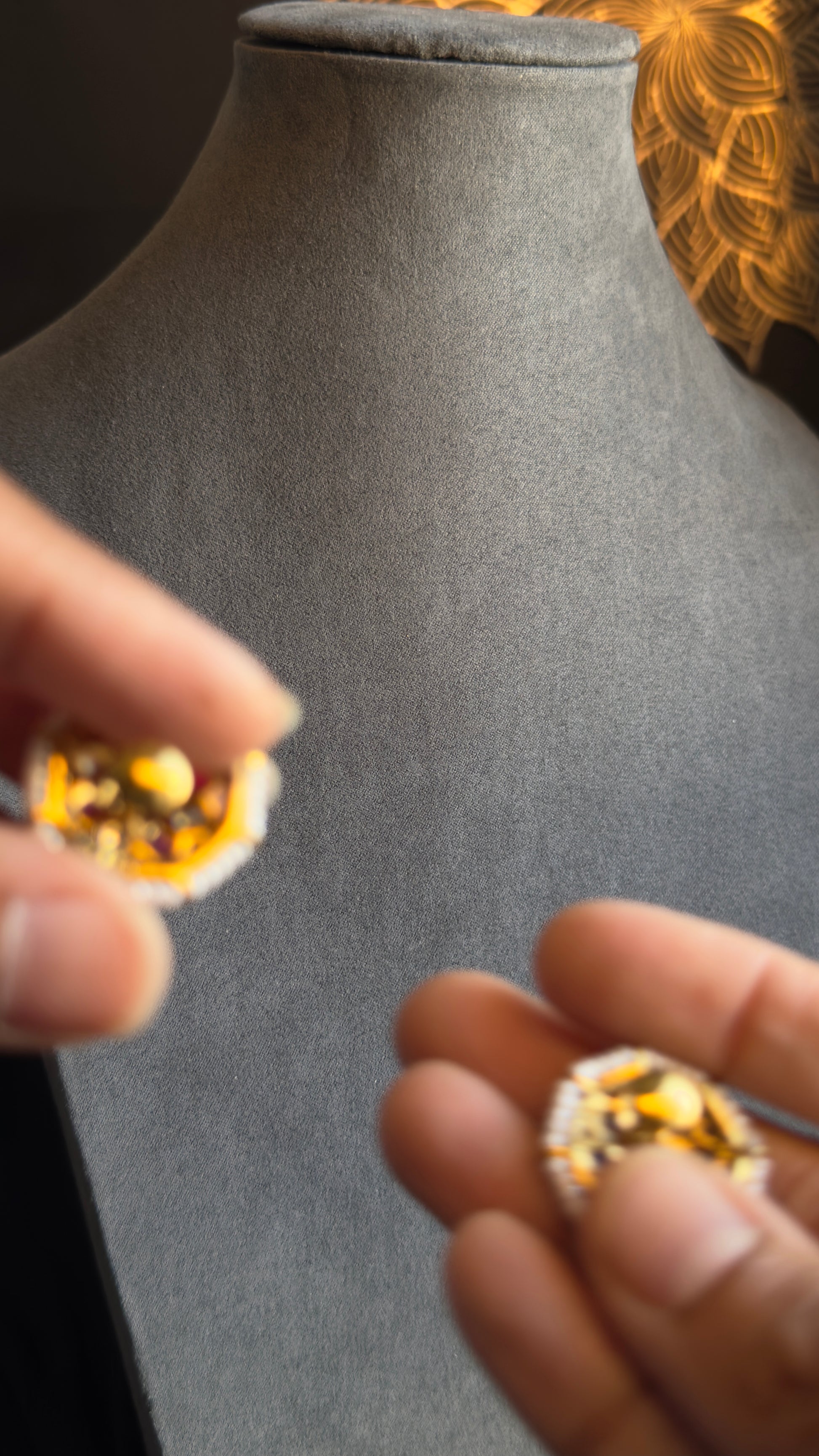 Add a splash of color to your ethnic wardrobe with these stunning Multi-Colored Kundan Stud Earrings, available in various vibrant designs. Crafted with American Diamond work and adorned with green, red, and ruby kemp accents, these earrings offer a versatile and elegant option for any traditional occasion. Whether you're dressing up for a wedding, festival, or special event, these earrings will complement your outfit beautifully.