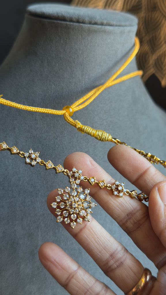Enhance your traditional attire with our exquisite gold-plated necklace, featuring a delicate pattern adorned with sparkling American diamonds with pendant. This stunning set, complete with matching earrings, is inspired by South Indian jewelry designs and is perfect for weddings, festivals, and special occasions.