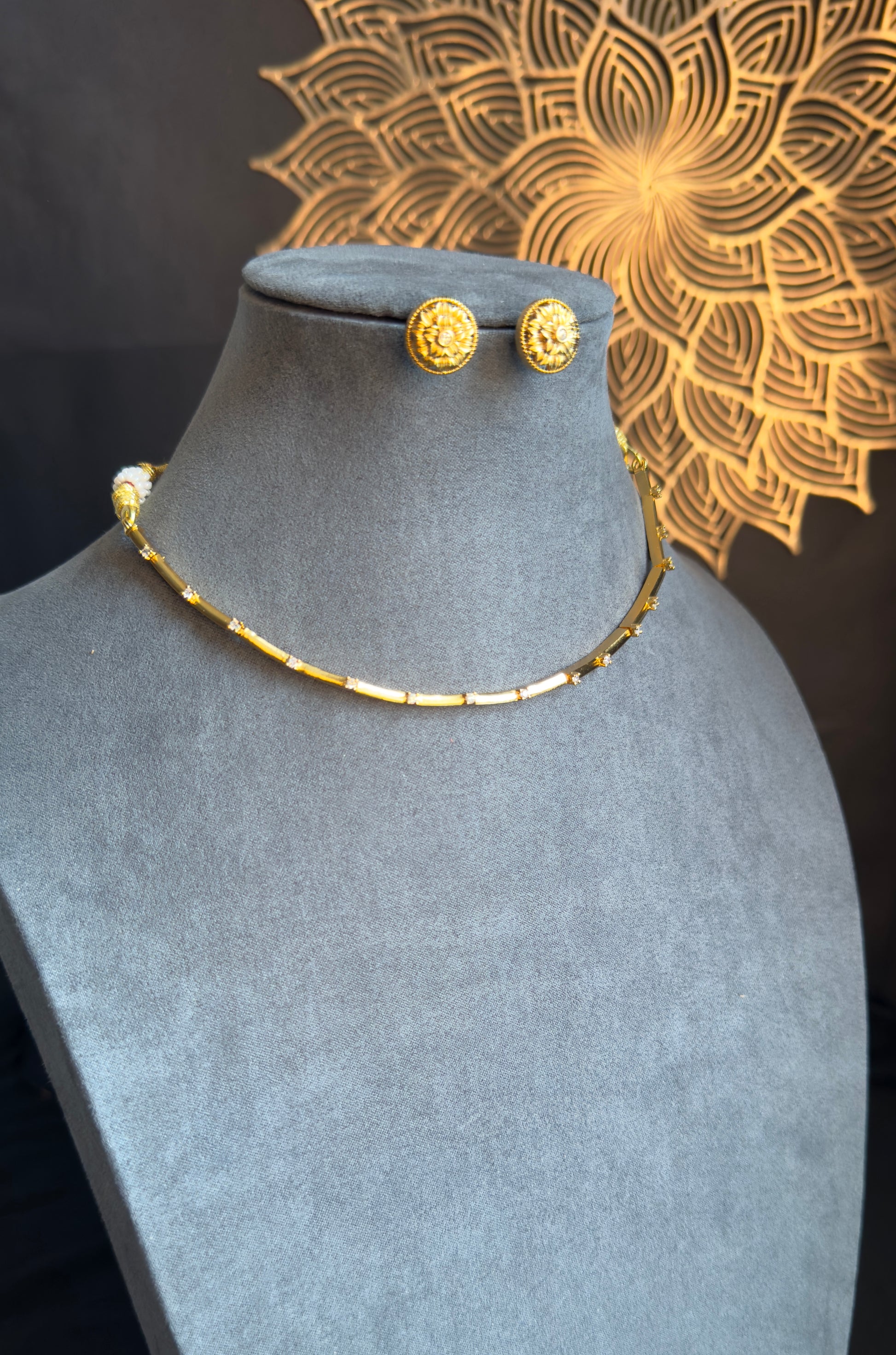 Embrace the elegance of traditional South Indian jewelry with this minimalist gold-plated choker necklace, complemented by matching coin stud earrings. This simple yet sophisticated design is perfect for any occasion, from weddings to casual gatherings.