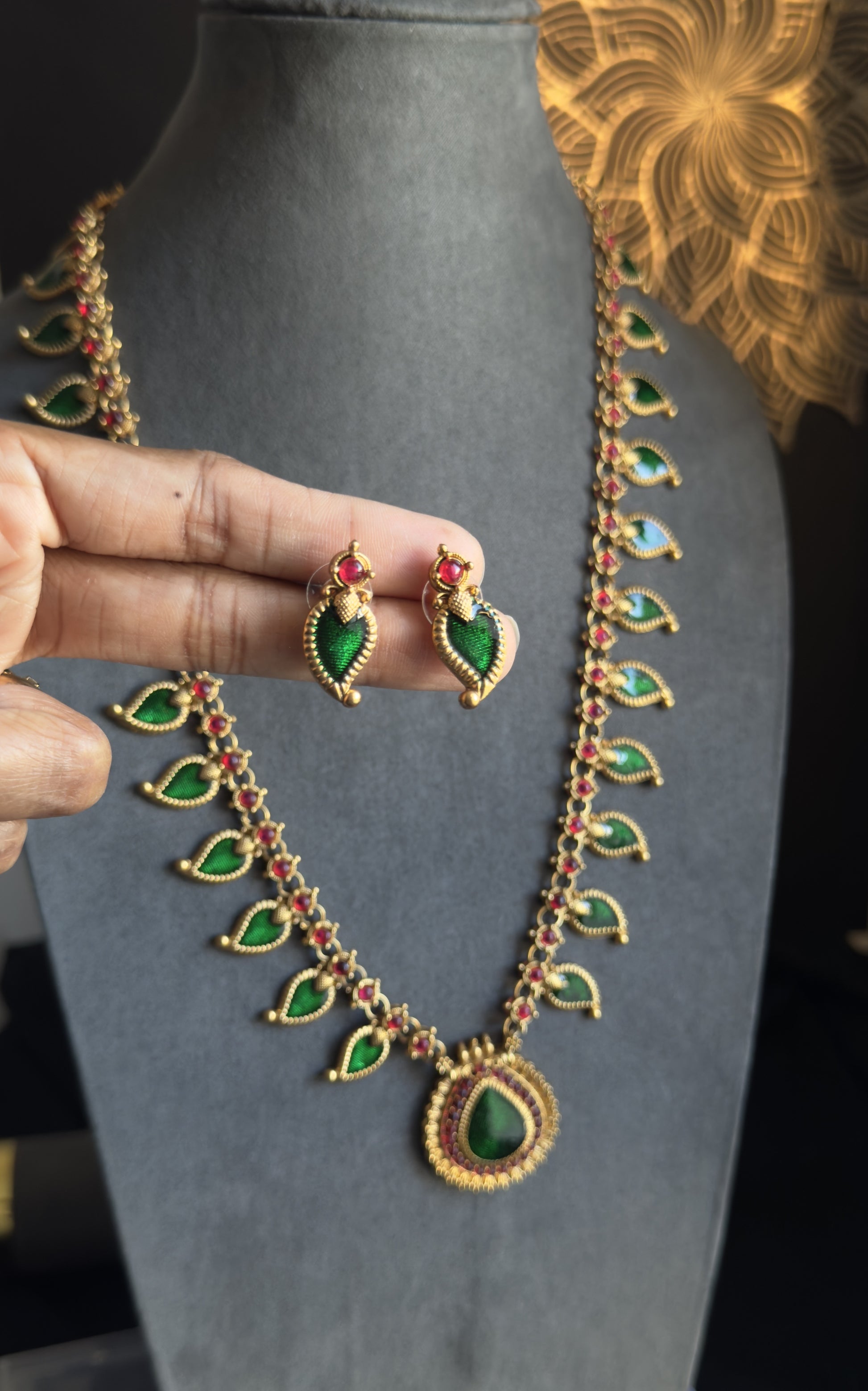 Adorn yourself with the elegance of this Traditional Paisley mango palakka row long Necklace Set, beautifully crafted with rich hand painted accents and fake kemp stones. This exquisite South Indian jewelry set features a stunning necklace paired with matching earrings, both adorned with classic stones that shimmer with a deep red hue.
