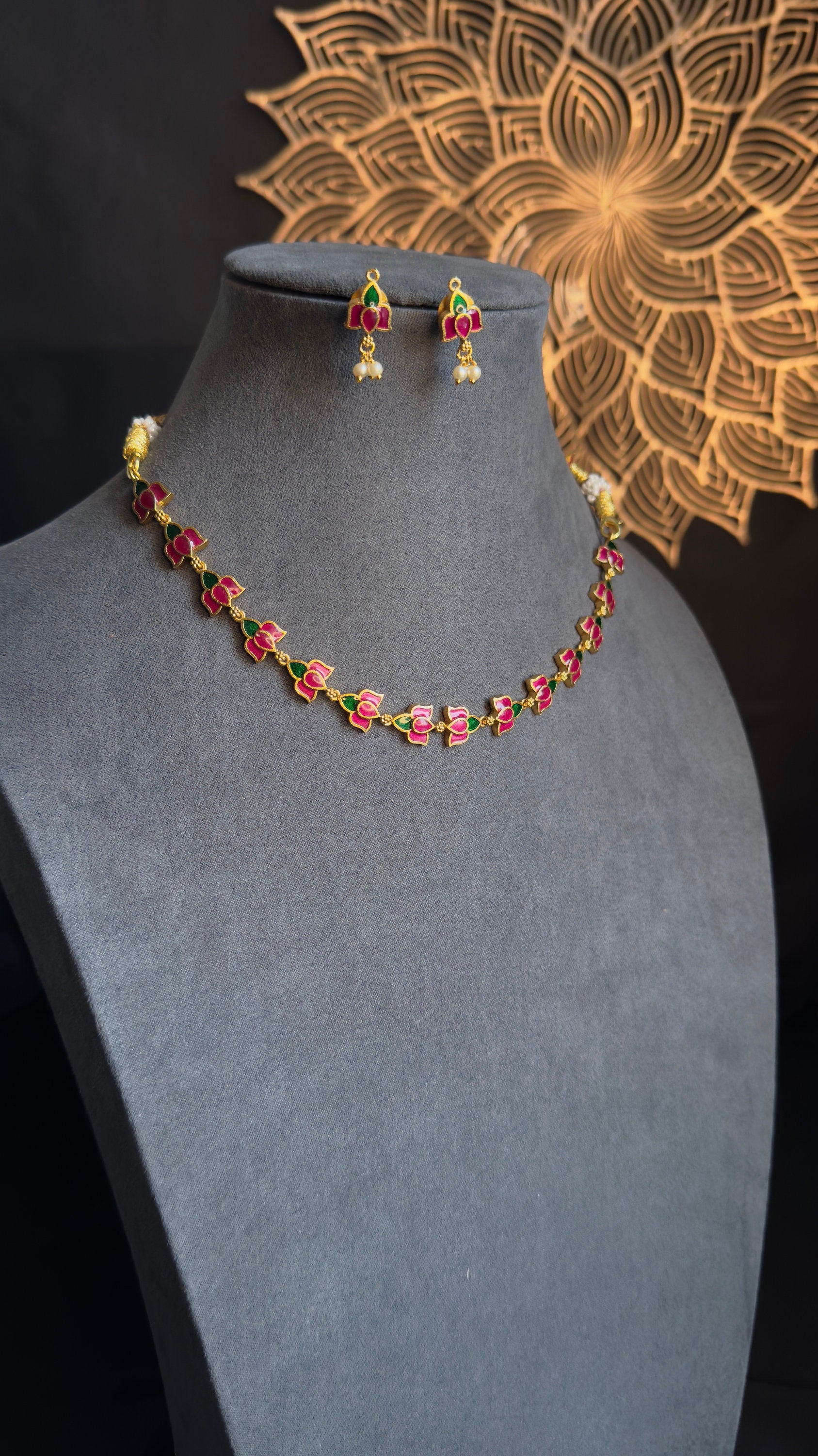 PANOPLY Dainty lotus hand painted Gold-Plated short necklace set/temple jewel/indian antique set/traditional jewel/south Indian jewelry
