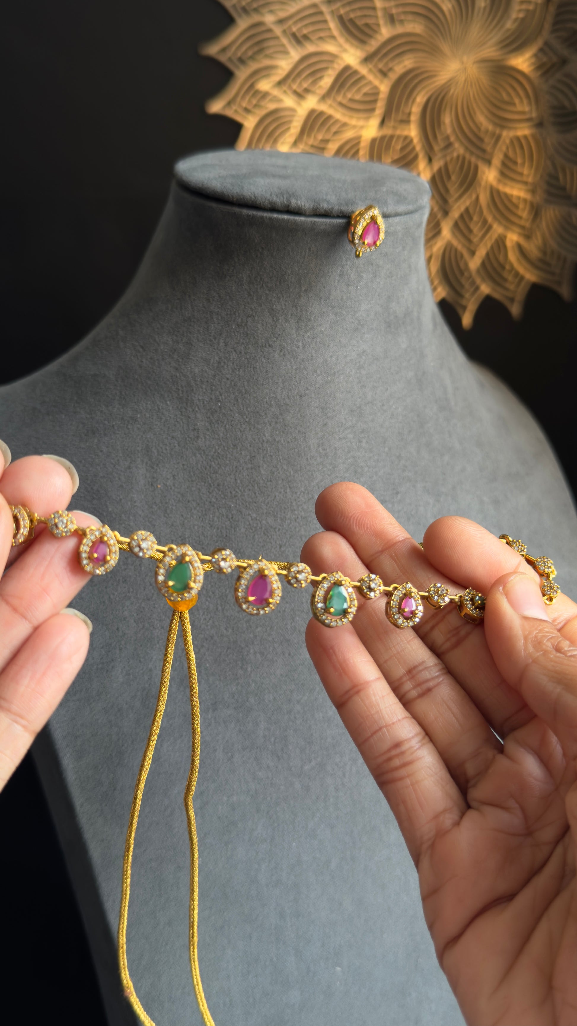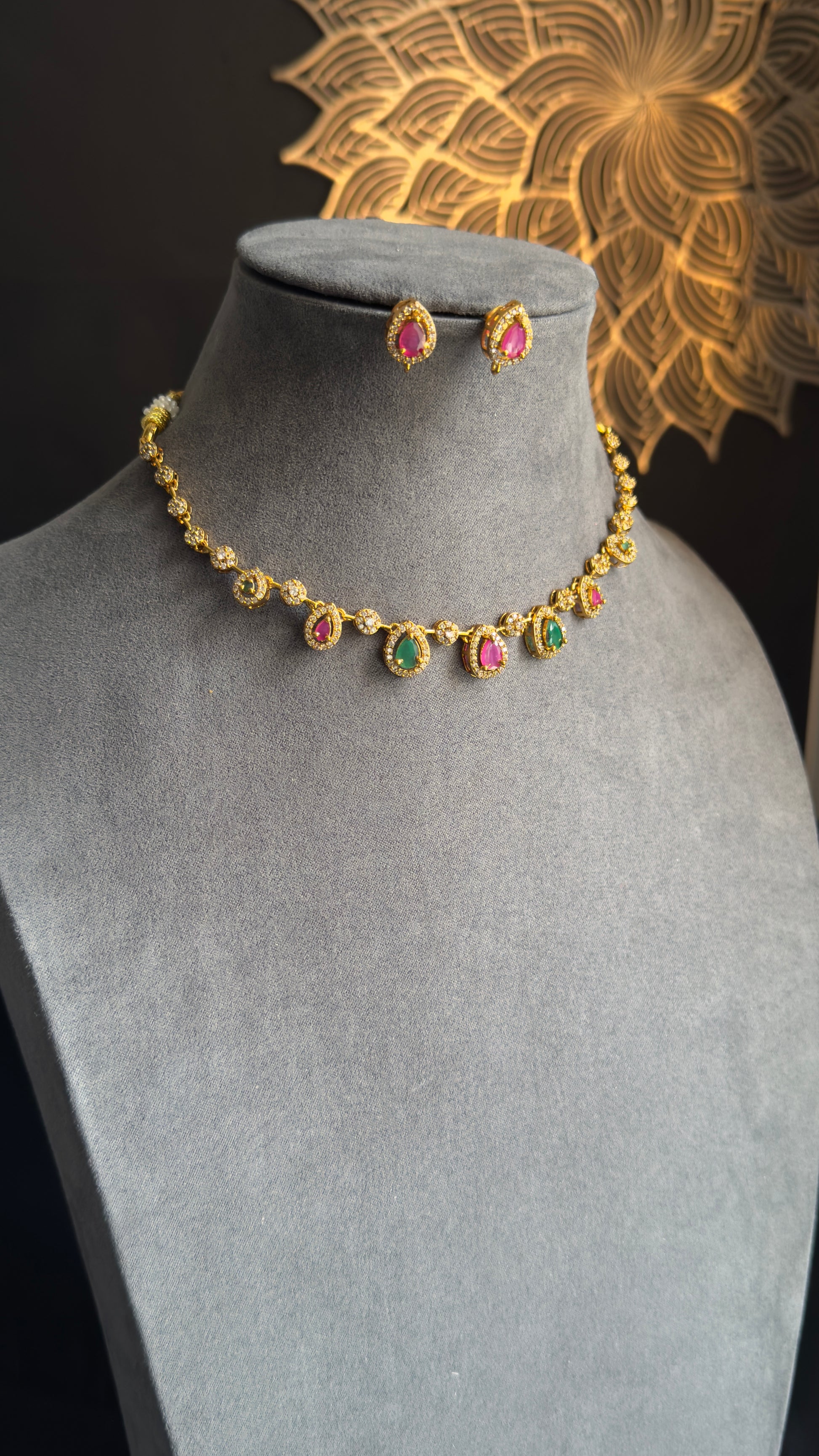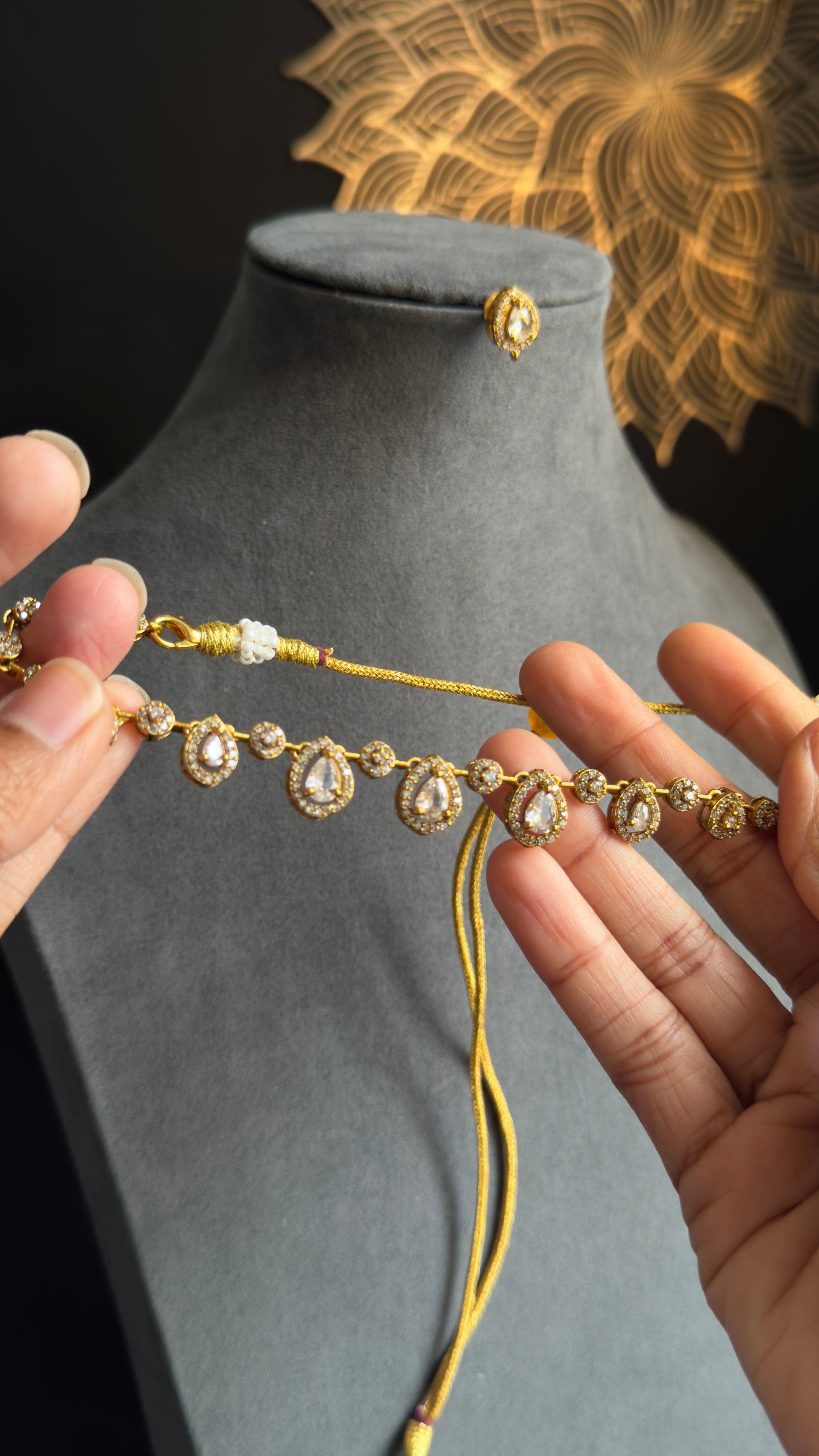Enhance your traditional attire with our exquisite gold-plated necklace, featuring a delicate flower pattern adorned with sparkling American diamonds. This stunning set, complete with matching earrings, is inspired by South Indian jewelry designs and is perfect for weddings, festivals, and special occasions.