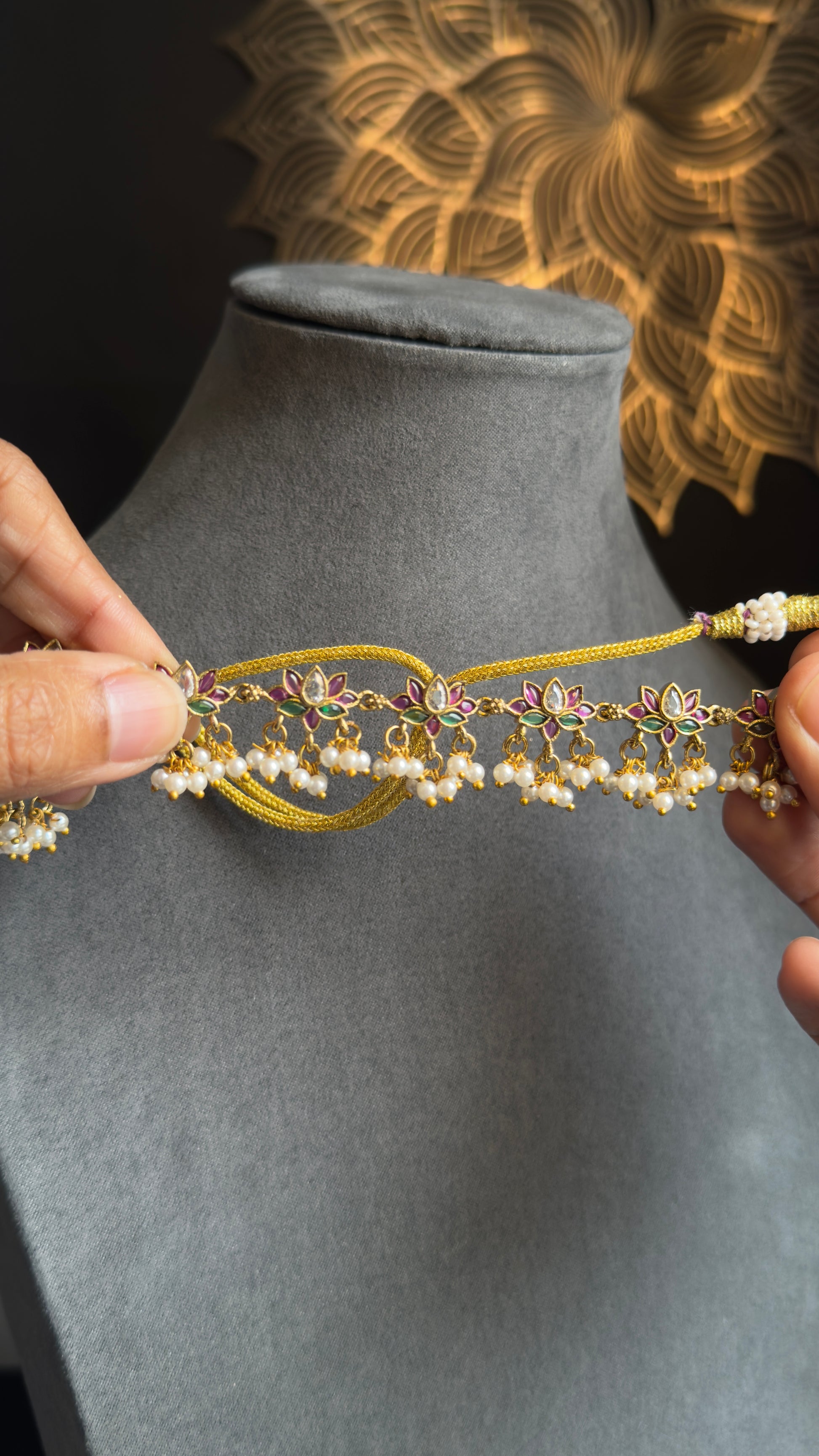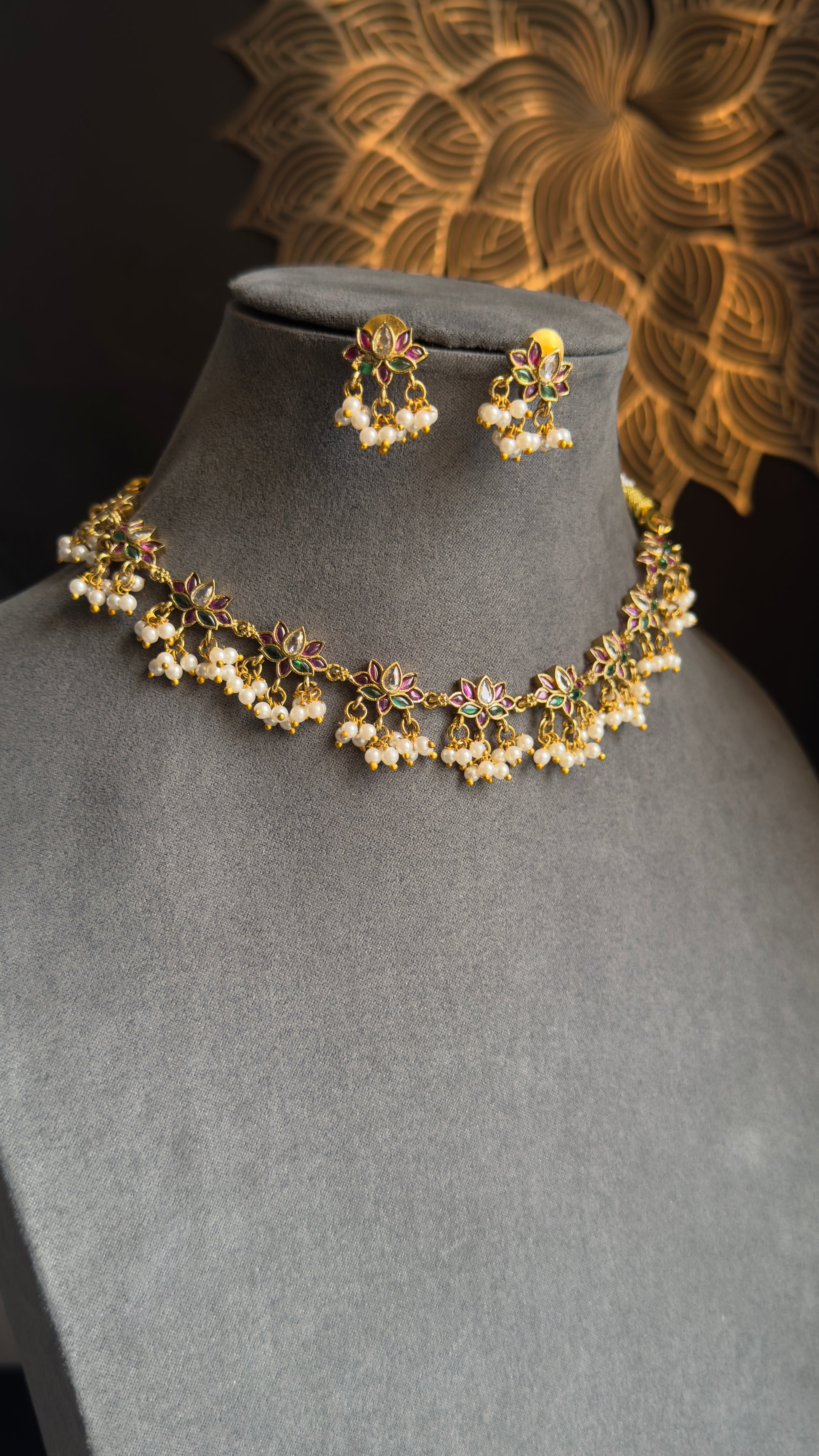 Panoply South Indian DAinty Lotus Necklace Set | Floral Pearl Choker with Earrings | Traditional Bridal Jewelry | South Indian Ruby Jewelry