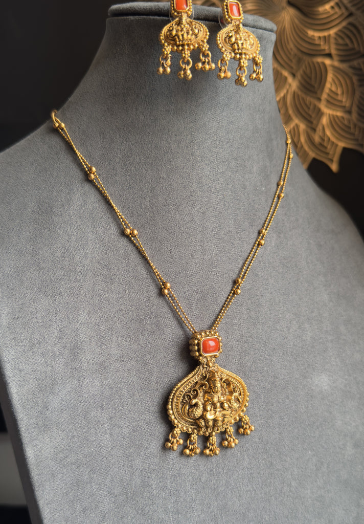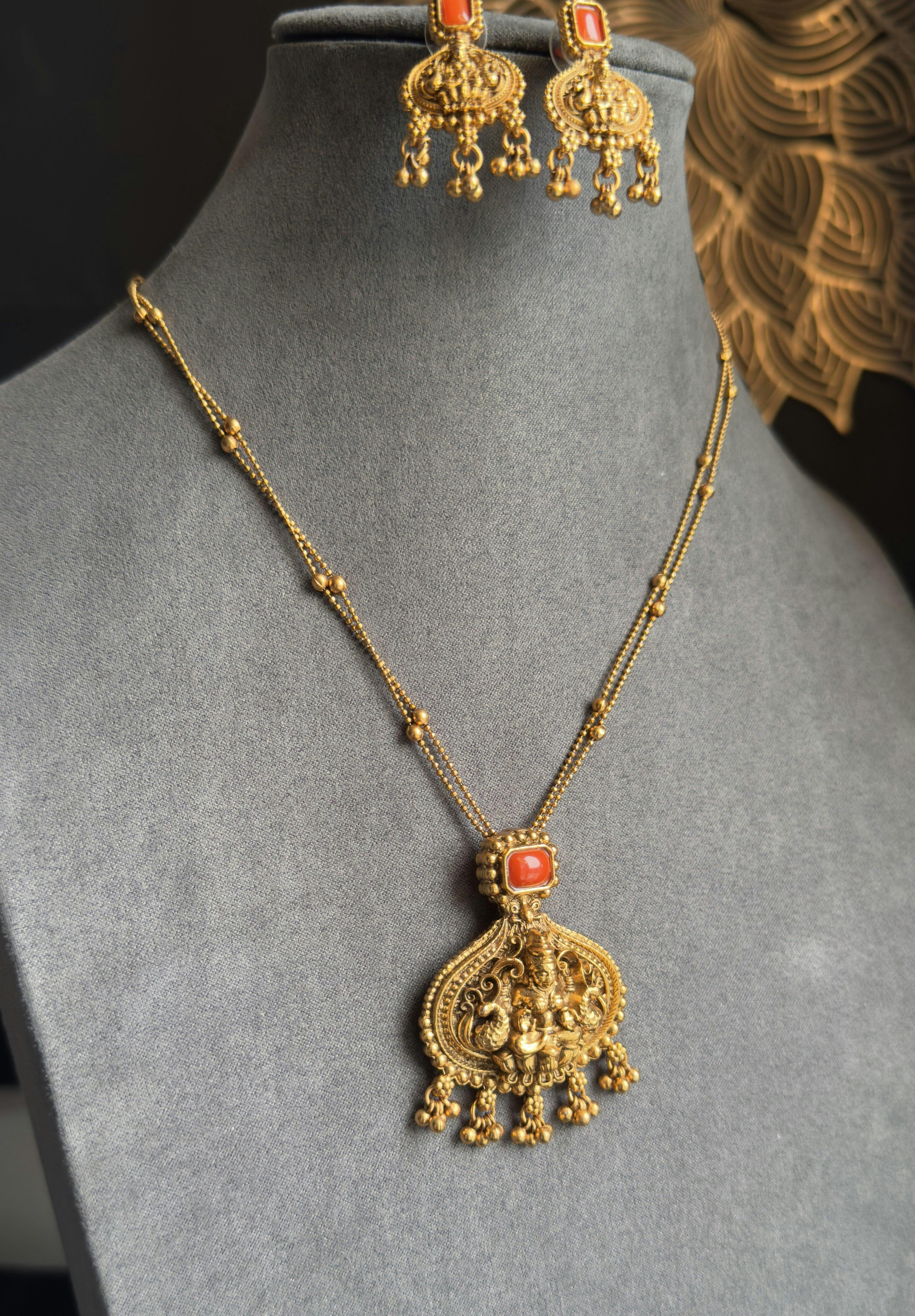 The pendant features Goddess Lakshmi detailing with a coral red stone accent, paired with matching temple-style earrings. Unlike heavy bridal temple jewelry, this design is lightweight, comfortable, and affordable, making it perfect for both festive and casual traditional wear.: