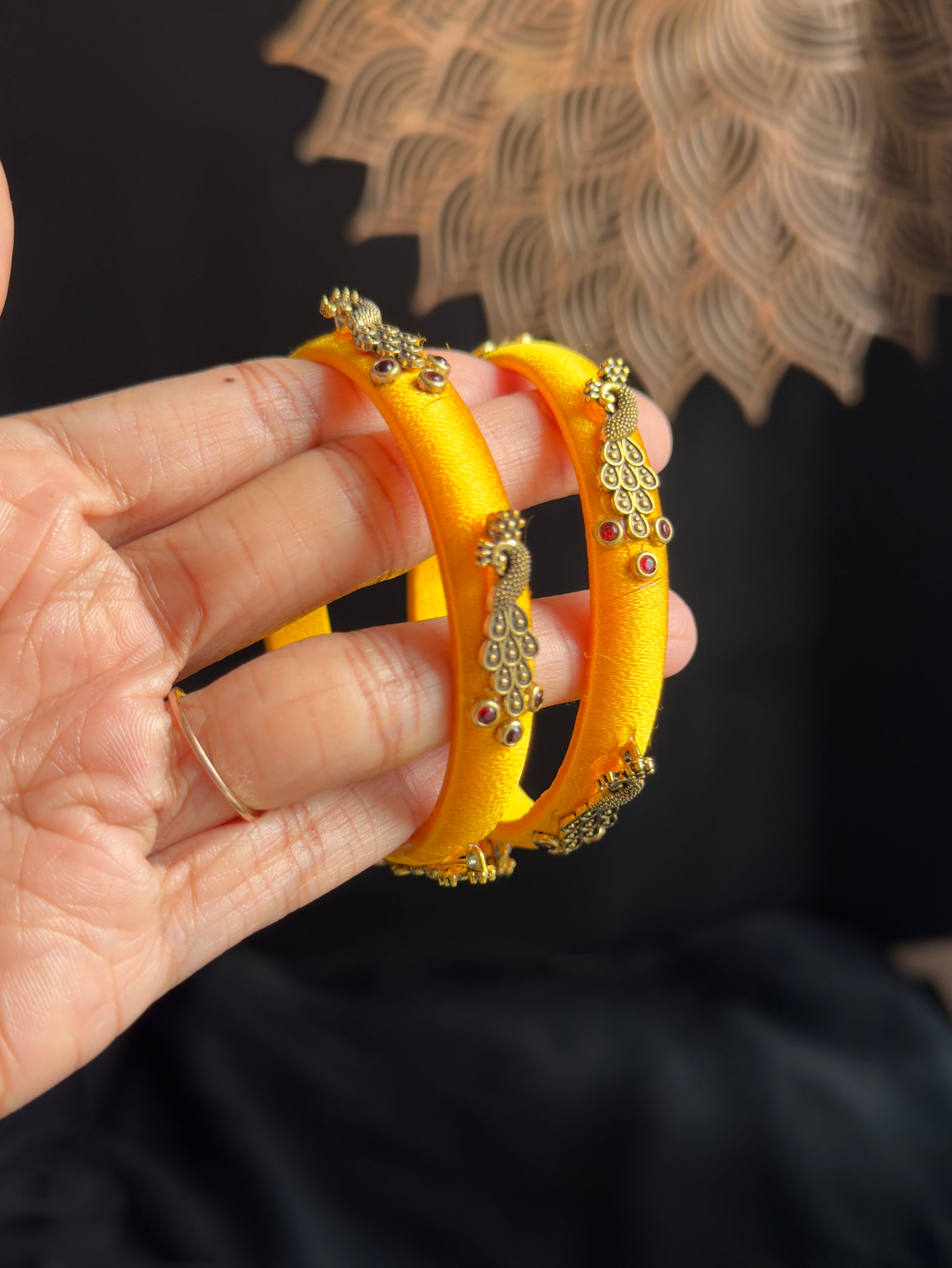 • Pair of yellow Handmade bangle peacock work
