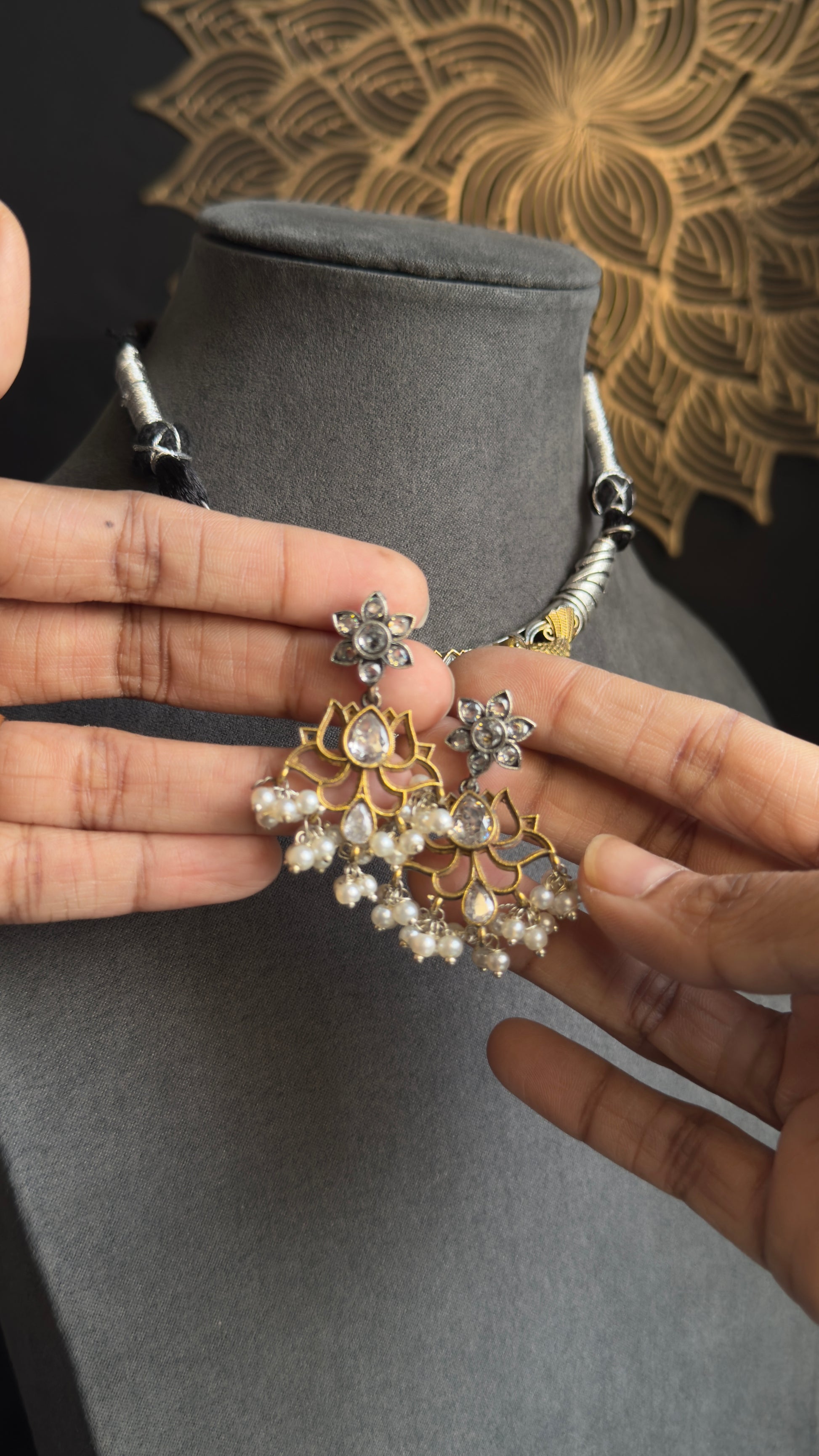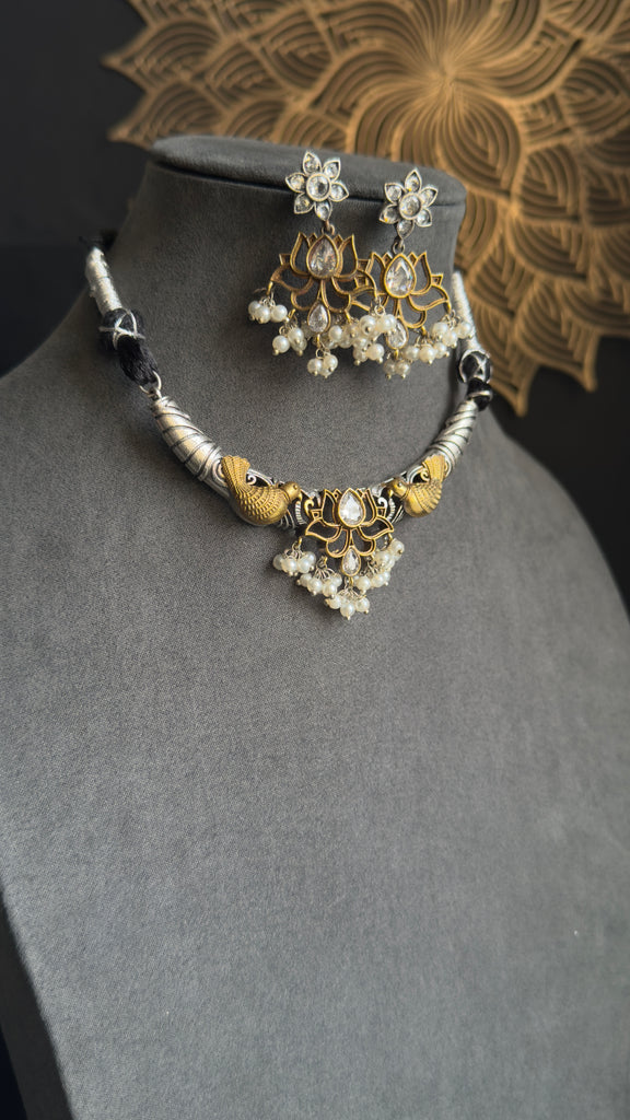 Pretty Dual Tone Silver-Plated Choker Set, a unique piece that blends antique charm with contemporary flair. This striking choker features an intricate design with beautiful lotus and bird motif, each adorned with vibrant multicolor stones that pop against the dual-tone silver and gold finish.