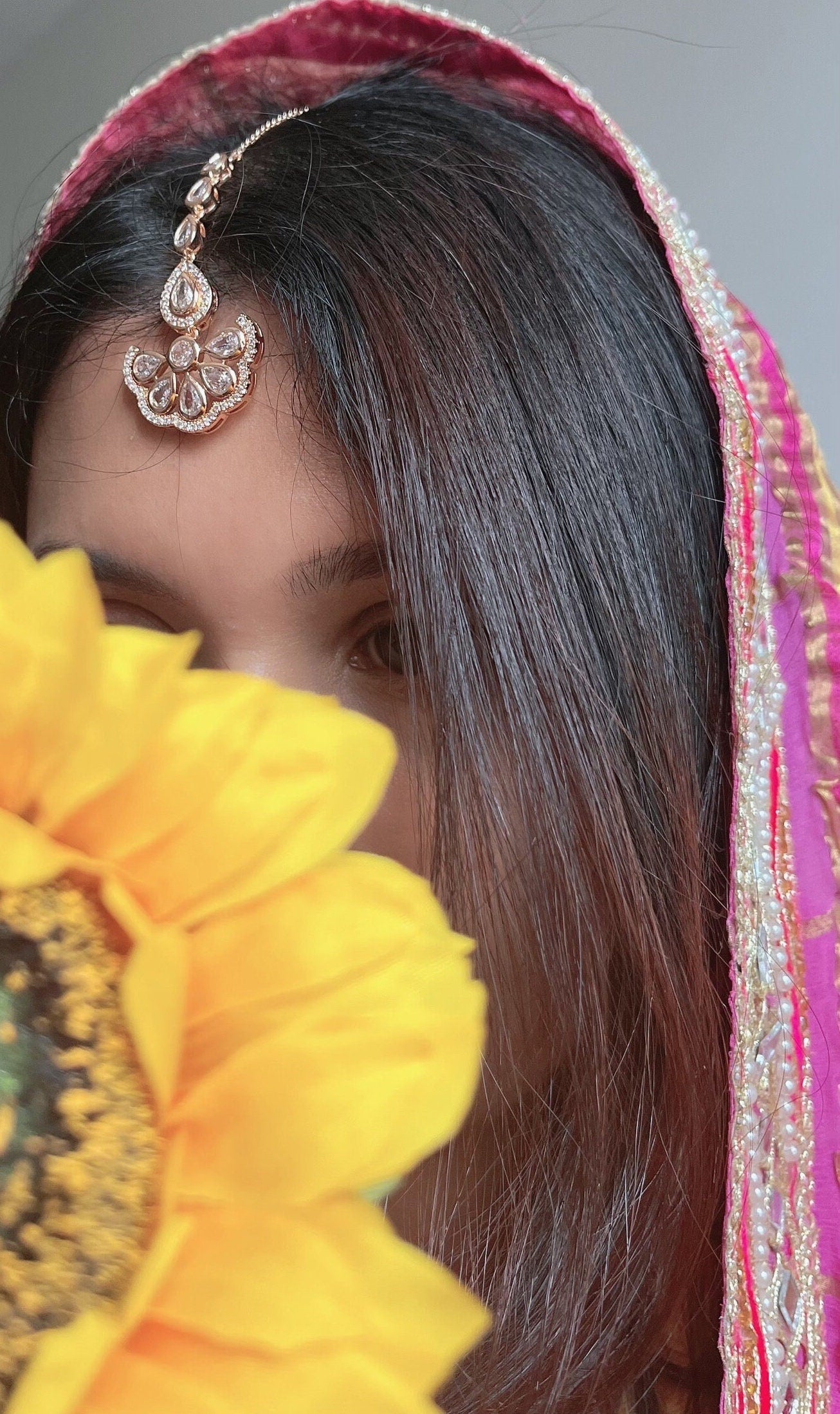 Adorn your forehead with the exquisite elegance of our Rose Gold American Diamond Tikka. This stunning piece of forehead jewelry features brilliant American diamonds set in a beautiful rose gold finish, perfect for adding a touch of sophistication to any traditional Indian or Pakistani attire. Ideal for weddings, festivals, and special occasions, this tikka offers a timeless and elegant look that complements any ethnic ensemble.