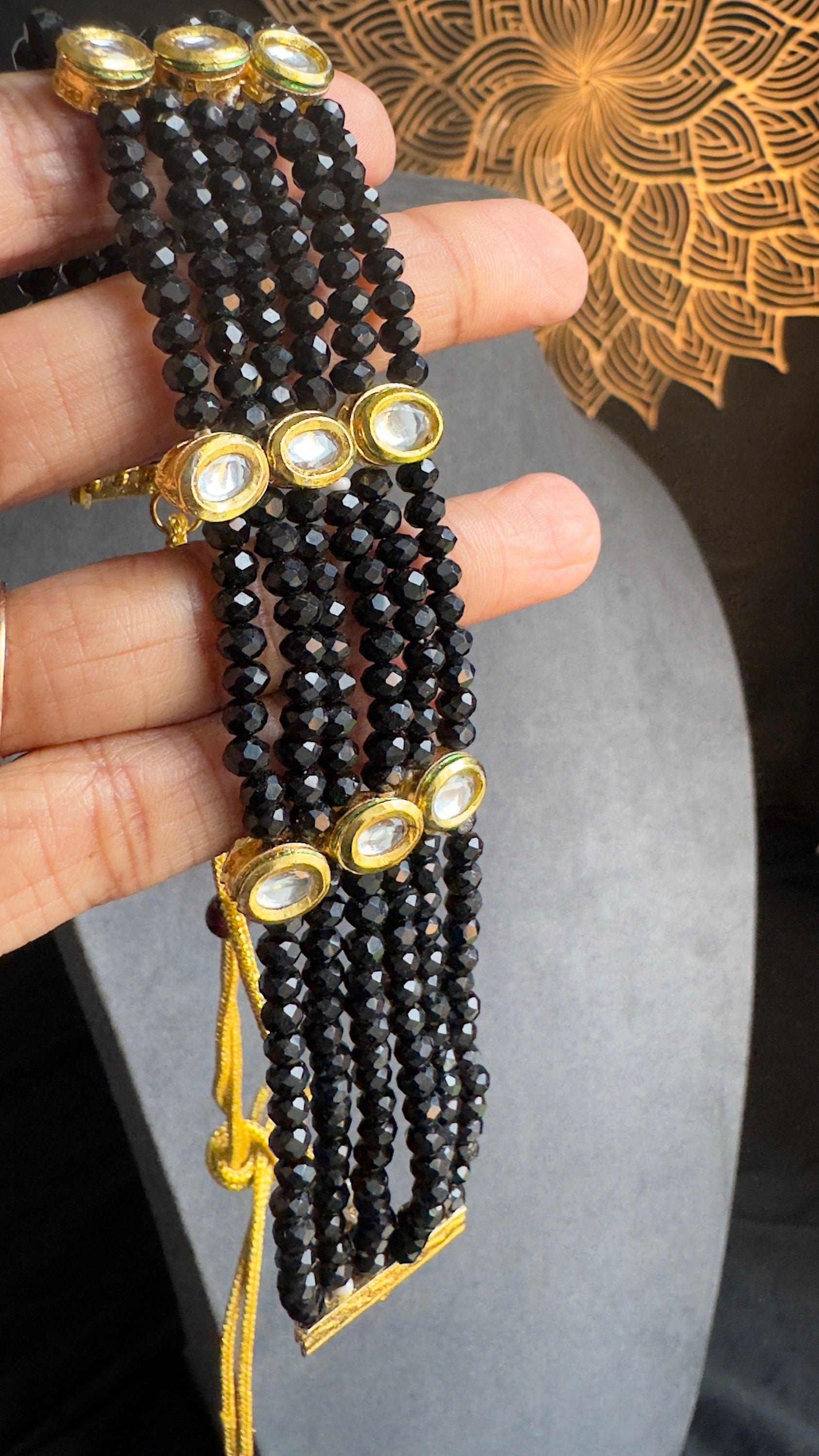 Elevate your traditional look with our exquisite Indian Black Onyx Beads Choker, featuring Faux Kundan stones and an intricately detailed Meenakari design on back.