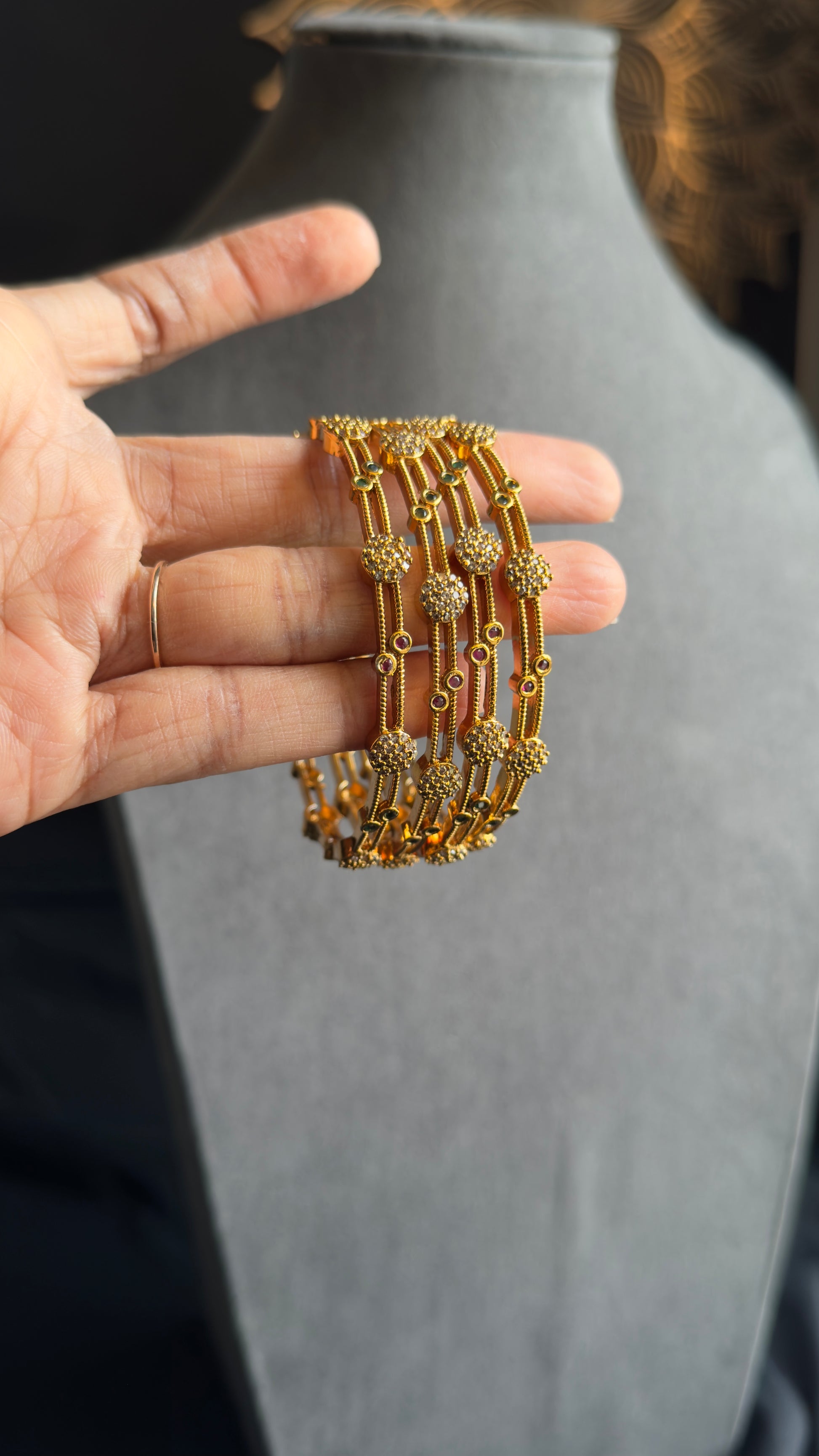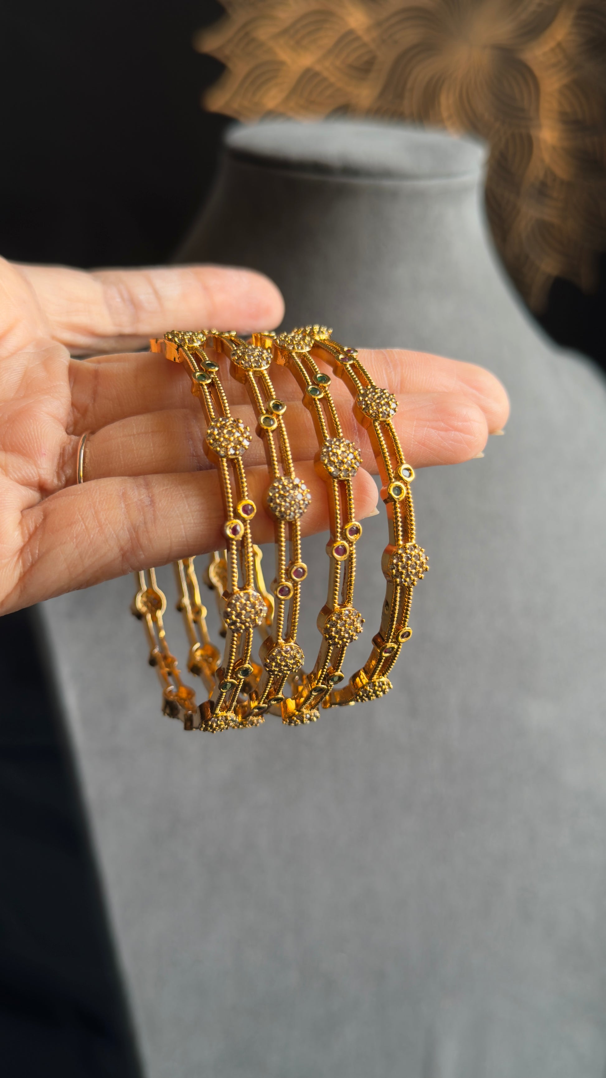 Embrace the traditional South Indian craftsmanship with this Antique Kada style Lined Kemp Bangle. These bangles are adorned with beautifully lined Kemp stones. This piece of jewelry embodies the rich cultural heritage of South India, making it a perfect accessory for traditional occasions and celebrations.