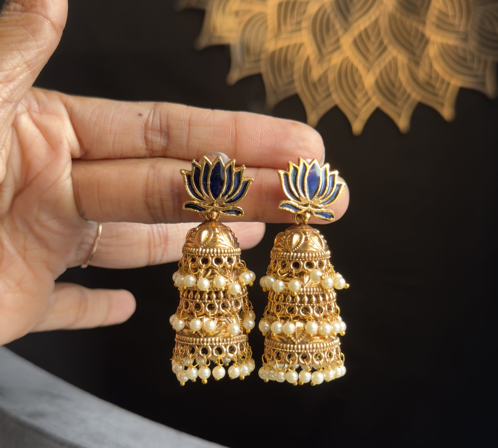 This design combines the sacred lotus motif with the timeless charm of temple-style jhumkas, making it a perfect accessory for weddings, festive wear, and cultural celebrations.