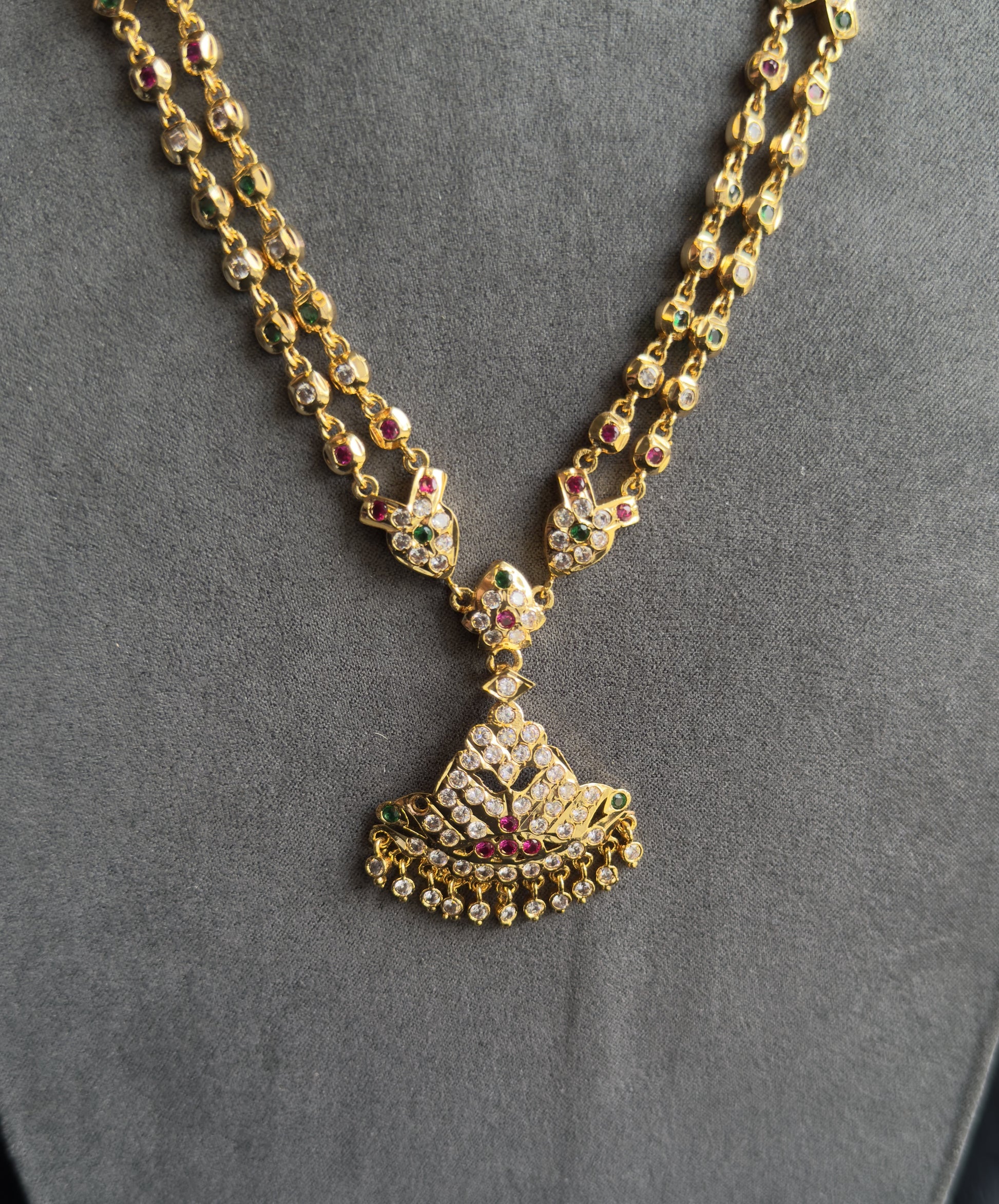 Elevate your traditional look with this elegant South Indian long necklace set, featuring classic kemp stones and pearl drop detailing. Finished in a rich gold tone, this set includes matching earrings and is perfect for weddings, festivals, and special occasions.