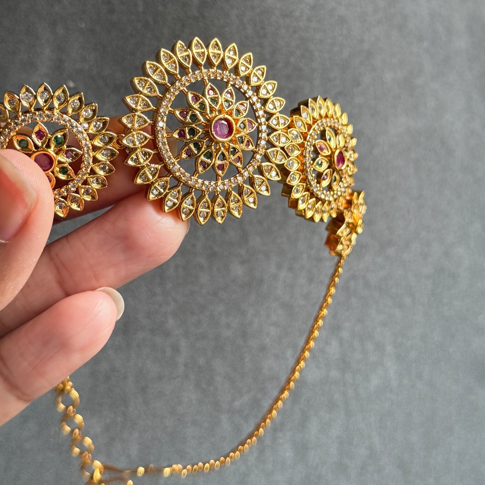 Adorn yourself with Fusion Triple chakra Necklace Set, featuring intricate American diamond complemented by matching dangler earrings.