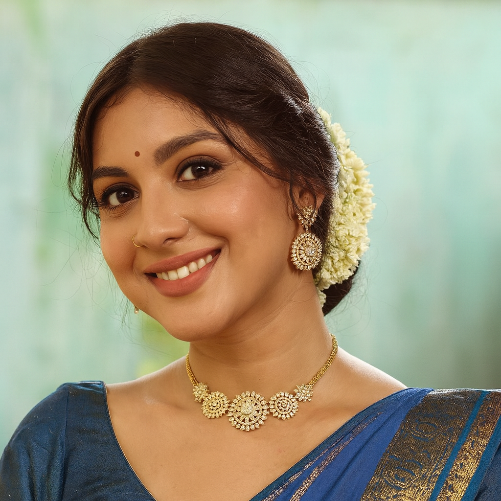 This South Indian traditional jewelry set, crafted in matt gold, is embellished with AD and kemp stones, making it a perfect choice for weddings, festivals, and special occasions. The antique design adds a touch of heritage charm to your ethnic collection.