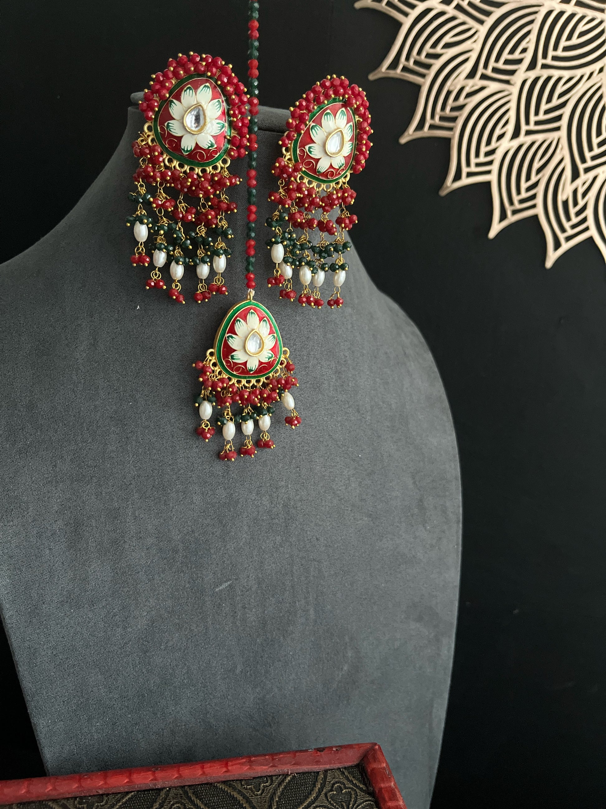 Unique Hand-Painted Meenakari Beaded Earrings | Mehendi Party Jewelry | Pearl Earrings Tikka Set